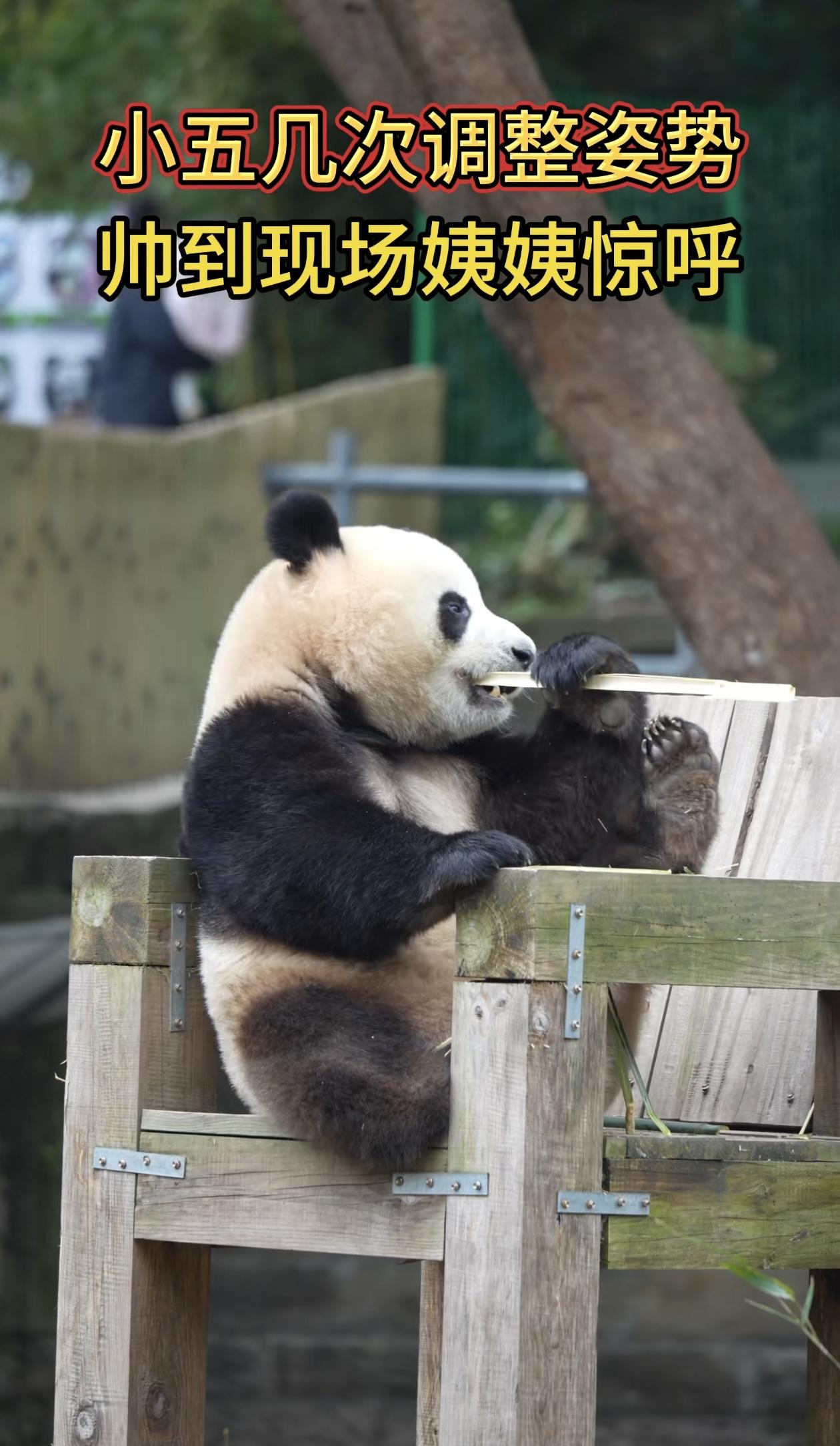 木架上的熊猫小五,正慵懒地调整着姿势,黑白相间的绒毛在光影里软乎乎的。它单手抓着竹子,坐姿挺拔又随性,像个自带气场的小绅士。 每一次换姿势都带着恰到好处的慵懒感,时而歪头啃食,时而撑着木栏眺望,憨态里藏着藏不住的帅气。现场的姨姨们忍不住惊呼,快门声此起彼伏,都想留住这只“熊猫帅哥”的可爱瞬间。 它大概不知道,自己只是随意摆了几个pose,就成了整个园区最耀眼的存在,用软萌和帅气,治愈了所有来看它的人。