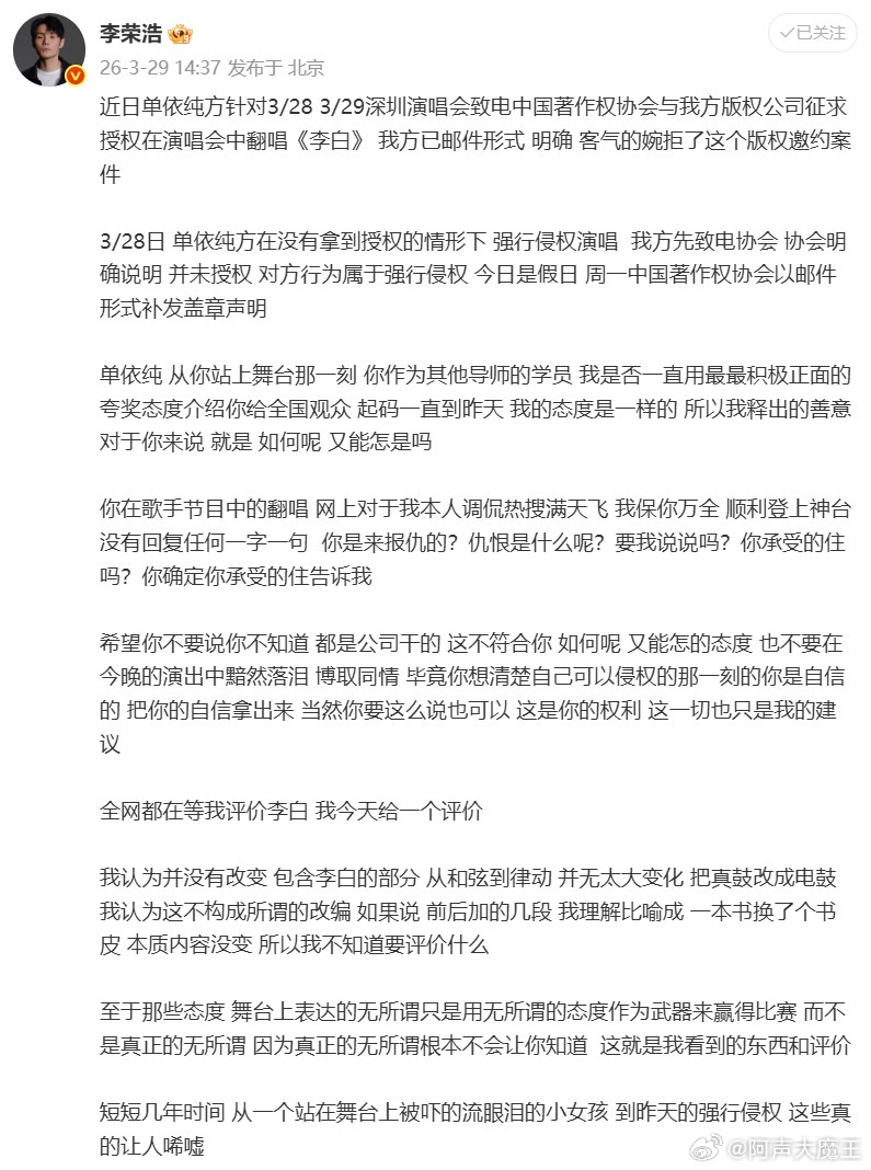 翻译:最近单依纯那边为了 3/28 和 3/29 的深圳演唱会,专门找了中国著作权协会和我的版权公司,想申请翻唱我的《李白》。我这边已经通过邮件,很客气但明确地拒绝了这个授权申请。结果 3/28 那天,单依纯在没拿到授权的情况下,硬要在演唱会上唱《李白》,这属于强行侵权。我先给协会打了电话,协会也明确说我没给过授权,她这个行为就是侵权。今天是节假日,等周一协会会用邮件补发盖了章的正式声明。单依纯,从你刚站上舞台、作为其他导师学员的时候起,我是不是一直都在镜头前用最积极、最正面的态度夸你、向全国观众介绍你?至少到昨天之前,我对你的态度都是这样的。我释放的这些善意,在你眼里到底算什么?你又是怎么回报我的?你在《歌手》节目里翻唱《李白》的时候,网上全是调侃我的热搜,我为了保你顺利晋级、登上神坛,一个字都没回应过。你现在这么做,是来报仇的吗?你心里的恨意到底是什么?要不要我把话说透?你承受得住吗?你确定你能承受得住,就告诉我。我劝你别拿 “我不知道、都是公司干的” 当借口,这根本不符合你那副 “如何呢 又能怎” 的态度。也别想着在今晚的演出里装可怜、掉眼泪博同情 —— 你要想清楚,你决定侵权的那一刻是很自信的,现在就把这份自信拿出来。当然你非要那么说也可以,那是你的权利,我只是给个建议。全网都在等我评价你翻唱的《李白》,今天我就给个评价:我觉得根本没什么变化,包含《李白》的部分,和弦、律动都没太大改动,只是把真鼓换成了电鼓,这根本算不上所谓的 “改编”。前后加的那几段,在我看来就像一本书换了个封面,本质内容一点没变,所以我真不知道还有什么好评价的。至于你在舞台上表现出的那副 “无所谓” 的态度,不过是拿 “无所谓” 当武器去赢比赛,根本不是真的无所谓 —— 真正的无所谓,根本不会特意让别人知道。这就是我看到的全部事实和评价。短短几年,你从一个站在台上会被吓哭的小女孩,变成昨天敢强行侵权的人,这一切真的让人唏嘘。