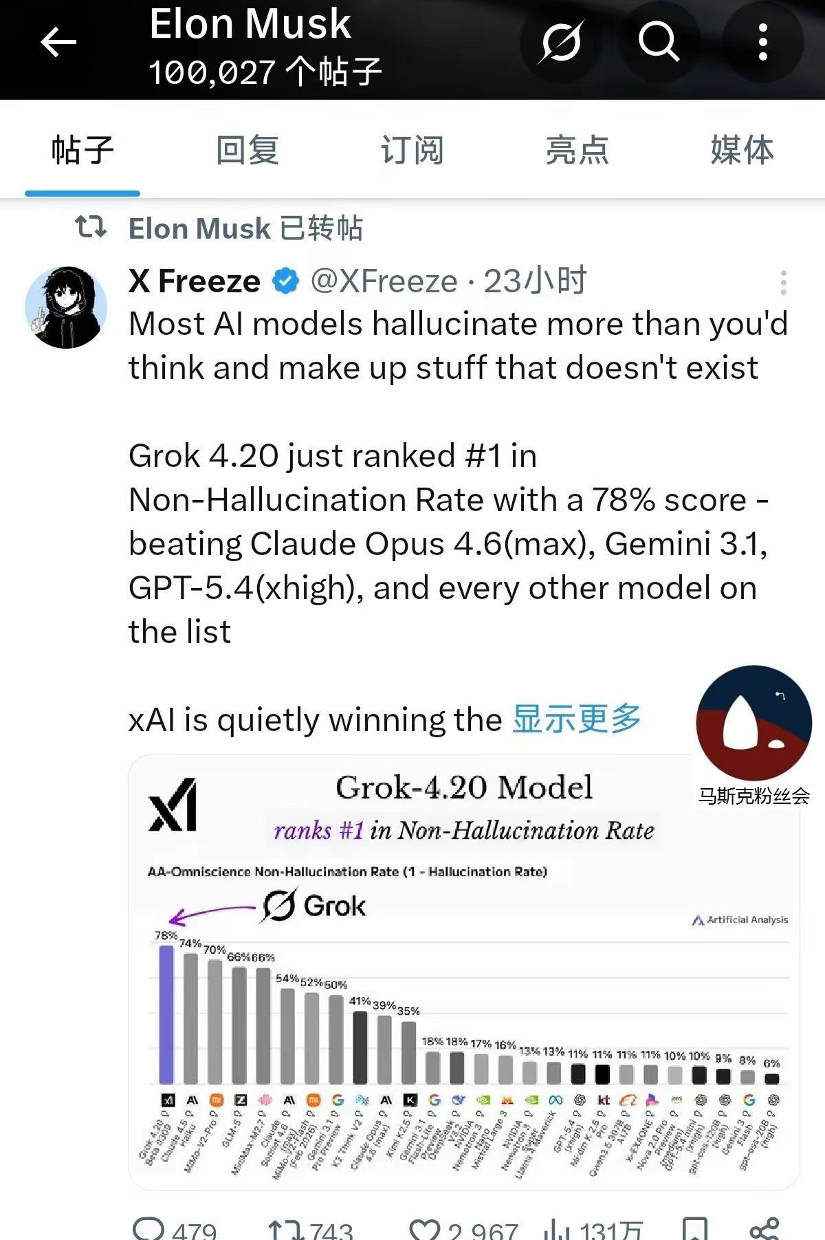 Grok4.2冲到非幻觉率第一名, 获得马斯克转帖。