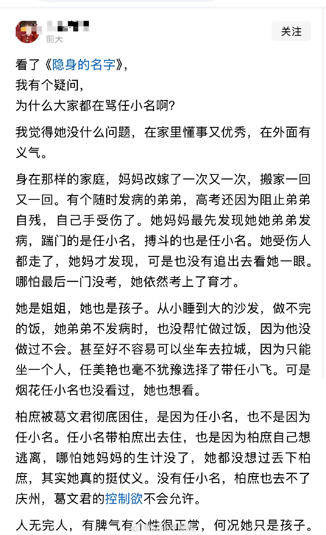 看了《隐身的名字》,我有个疑问,为什么大家都在骂任小名啊?