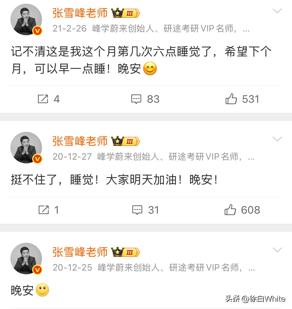这十年,张雪峰在凌晨跟大家说了无数次晚安,最后一次,大家先说!“先生,晚安,人间值得,记得早点回来!”“先生,晚安,这一觉睡好一点,久一点!”“先生,晚安,脚步停了,但精神未停!”“先生,晚安,您对的起所有信任您的人!”“先生,晚安,睡觉前没跑步,是不是有些不习惯,今天苏州千米长队,众人力挺您,您看到了么?在您的世界里,夺了冠军!”……………………跟张雪峰道晚安之余,别忘了跟自己道晚安,早点睡,晚点起,在生命面前,梦想微不足道,照顾好自己的身体,别让它透支!