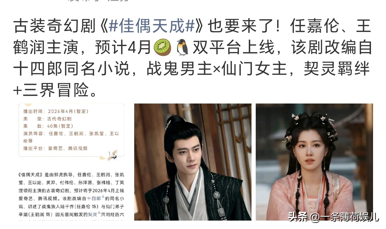 张凌赫、田曦薇的《逐玉》刚播完龚俊、任敏《家事法庭》正在播陈鑫海、张淼怡 《兄友妹恭》已安排李昀锐、黄杨钿甜《冰湖重生》4月上旬任嘉伦、王鹤润《佳偶天成》4月底钟汉良、朱珠《蜜语纪》5月初张凌赫、王楚然《这一秒过火》已过审鞠婧祎、张云龙《来战》暑期档