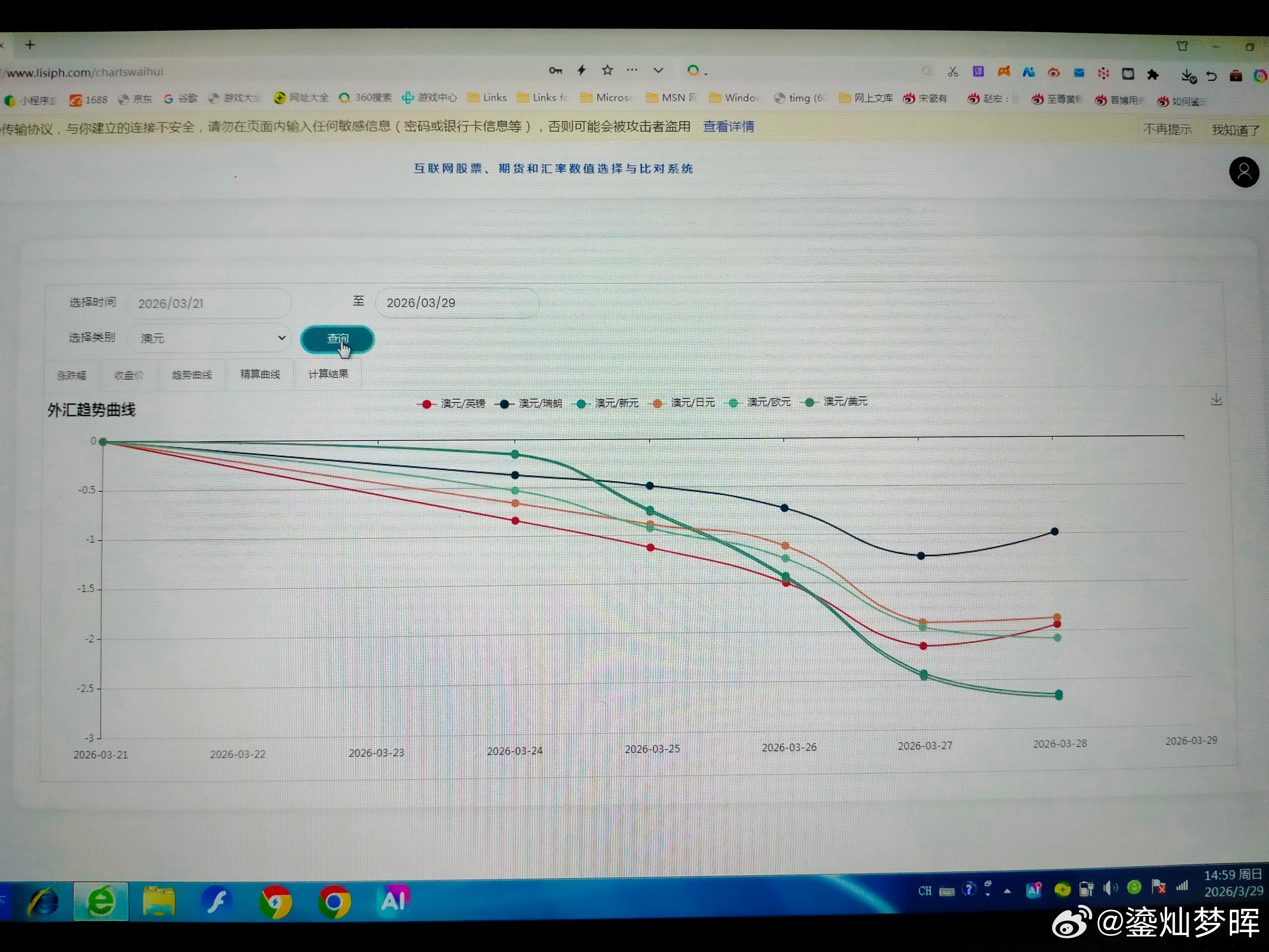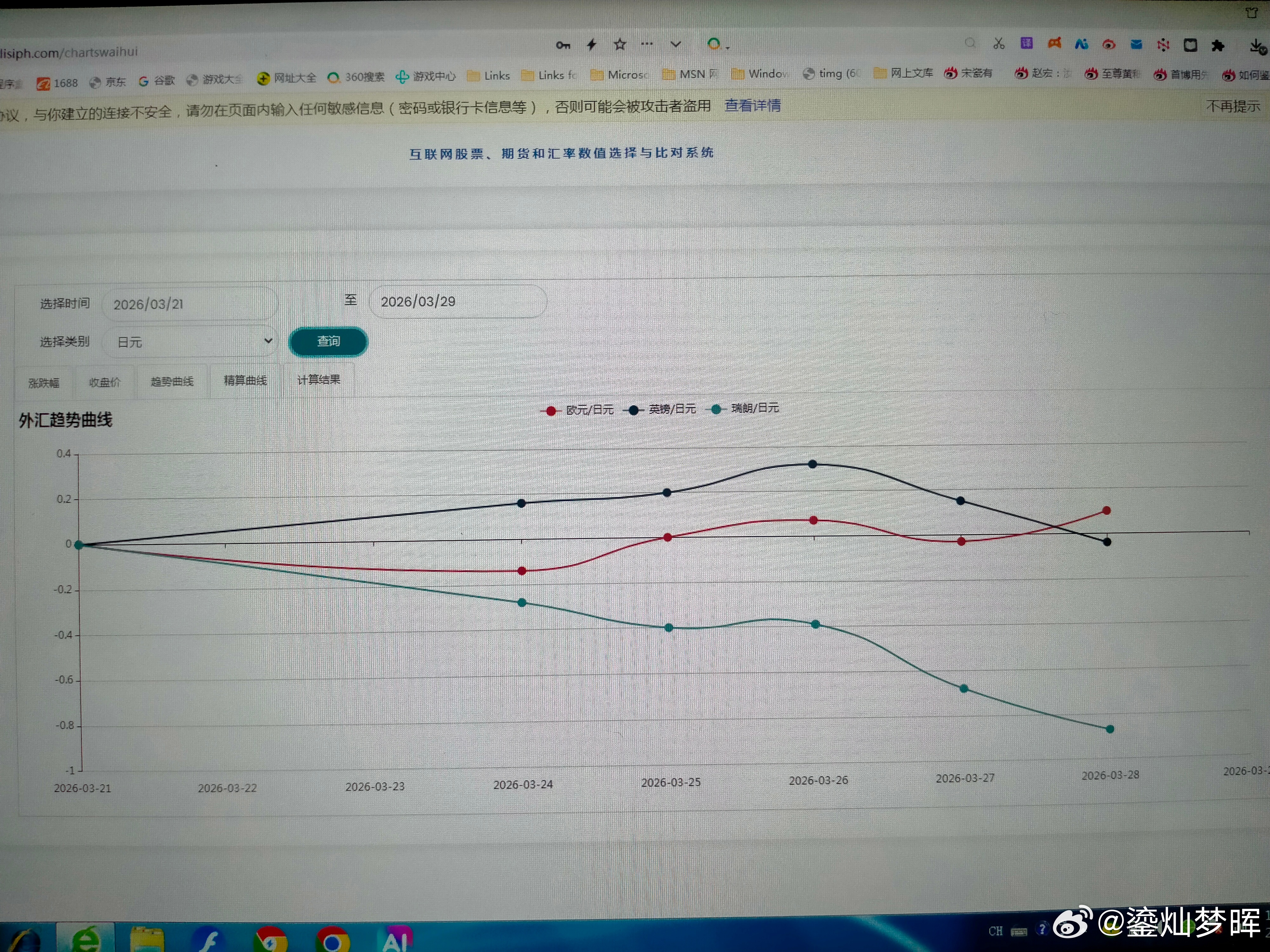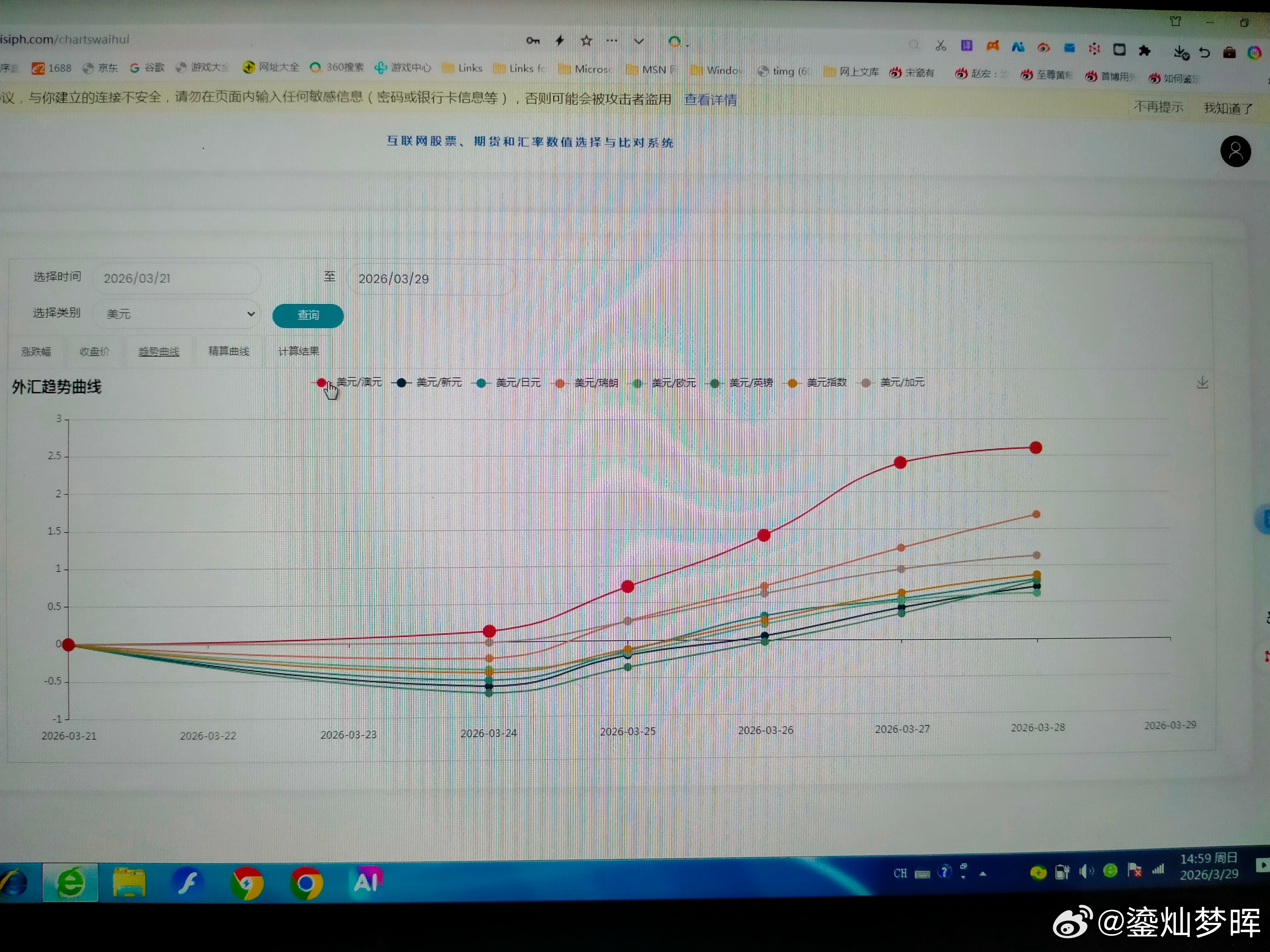 本周主要汇率走势 本周美元最强,澳元最弱。 图一是美元本周的涨跌幅曲线,除了周一下跌外,后面连涨了四天。图二是趋势曲线,兑其他几个主要币种都是上涨的。中东冲突升级和延续,都可能促使市场青睐美元。所以,估计会持续一下吧? 图三是澳元本周的趋势曲线,澳元终于下跌了。相对来说,澳洲可能受冲突影响会大一点。澳元在高位震荡了一段时间了,跌一下可能会更安全一点。 图四是欧元本周的趋势曲线,图五是英镑本周的趋势曲线,图六是瑞郎本周的趋势曲线,如果冲突延续,欧洲三个主要币种可能都不会太强势。 图七是兑日元的趋势曲线,图八是兑加元的趋势,日元和加元算是比较强。但可能不会延续太久。因为不是主要的收益币种。 图九是正向和反向态势图,现在英镑在高位区域,还是要注意风险了。澳元进入低位区域,看看什么时候见底吧。