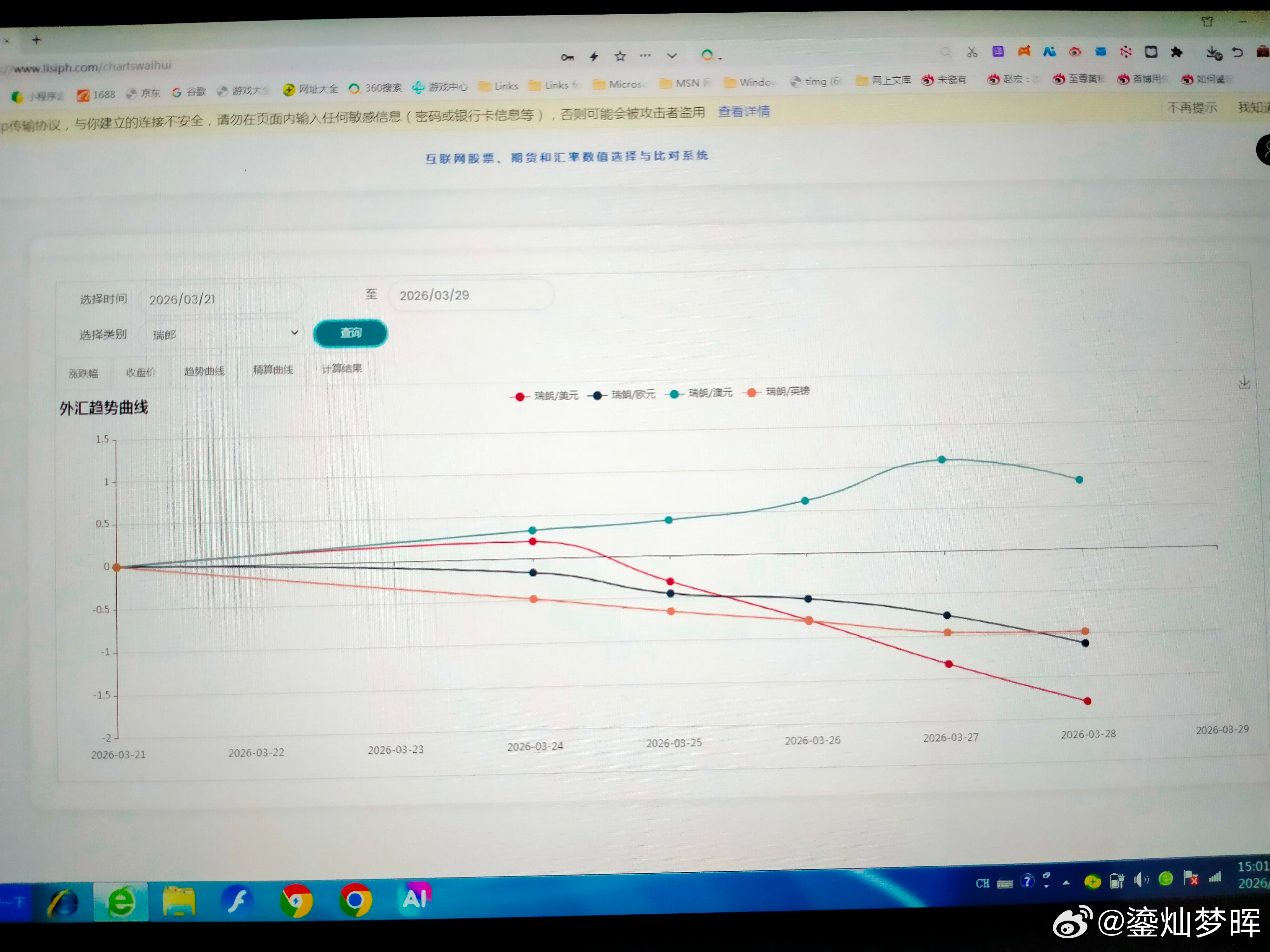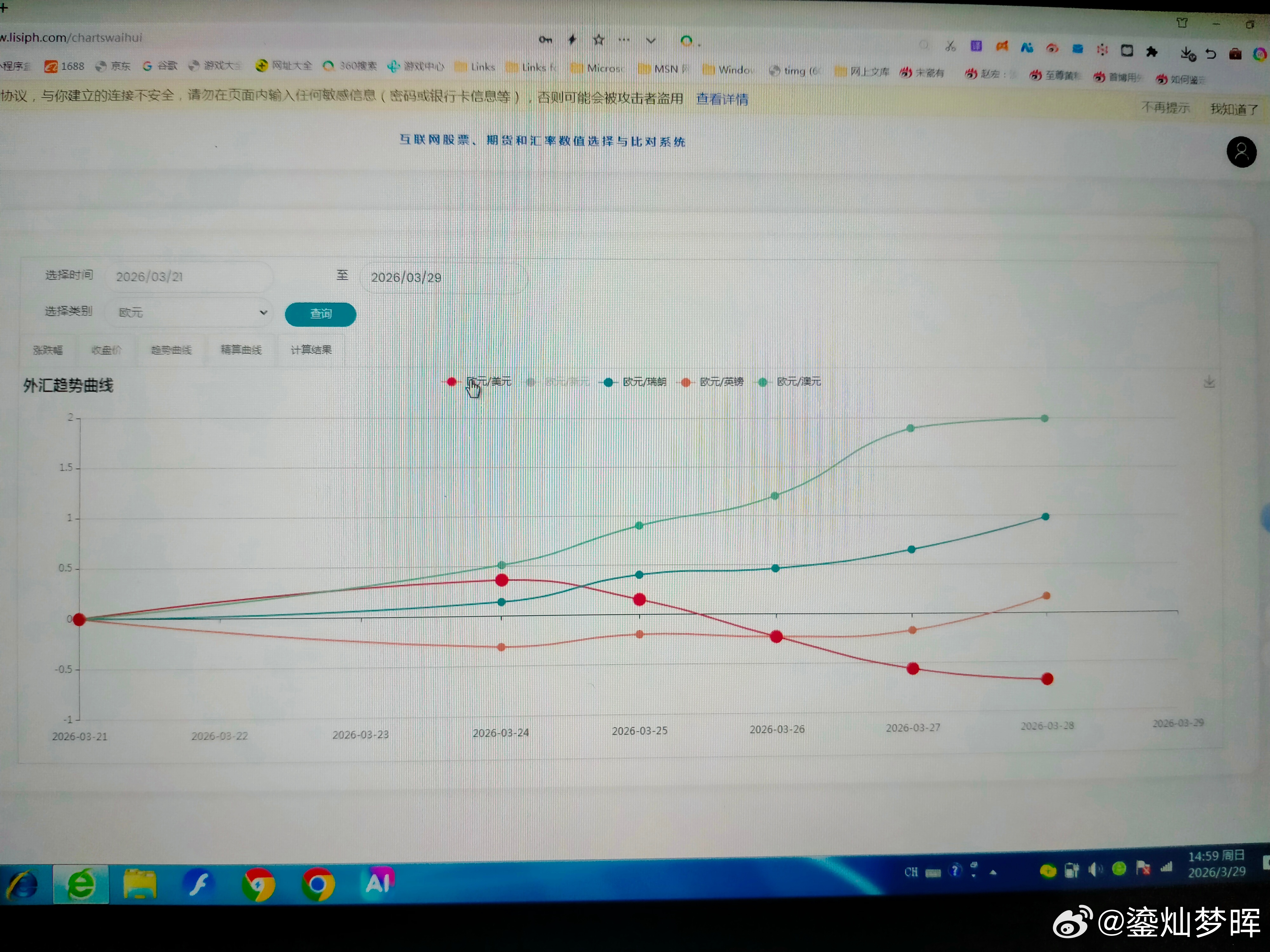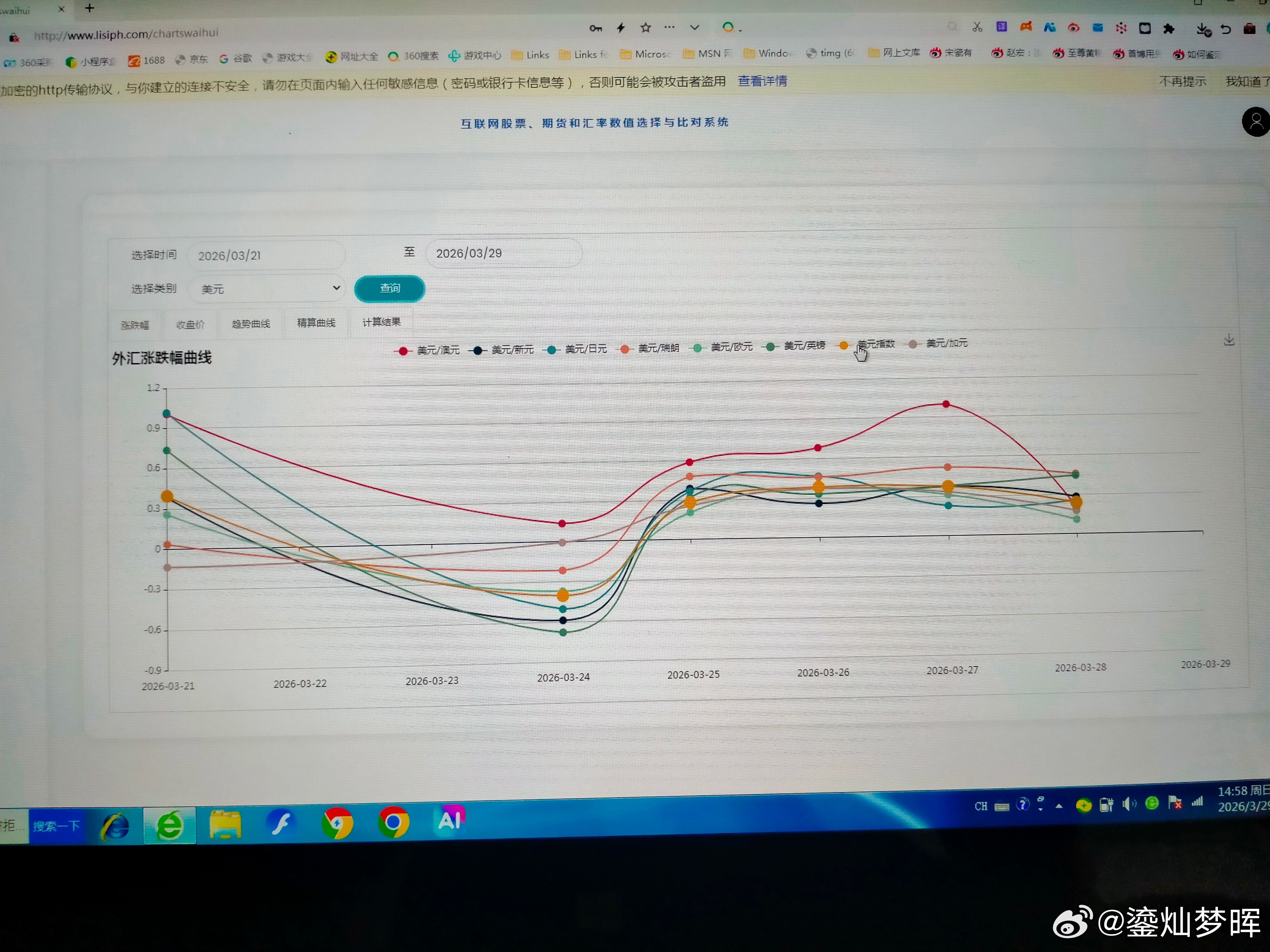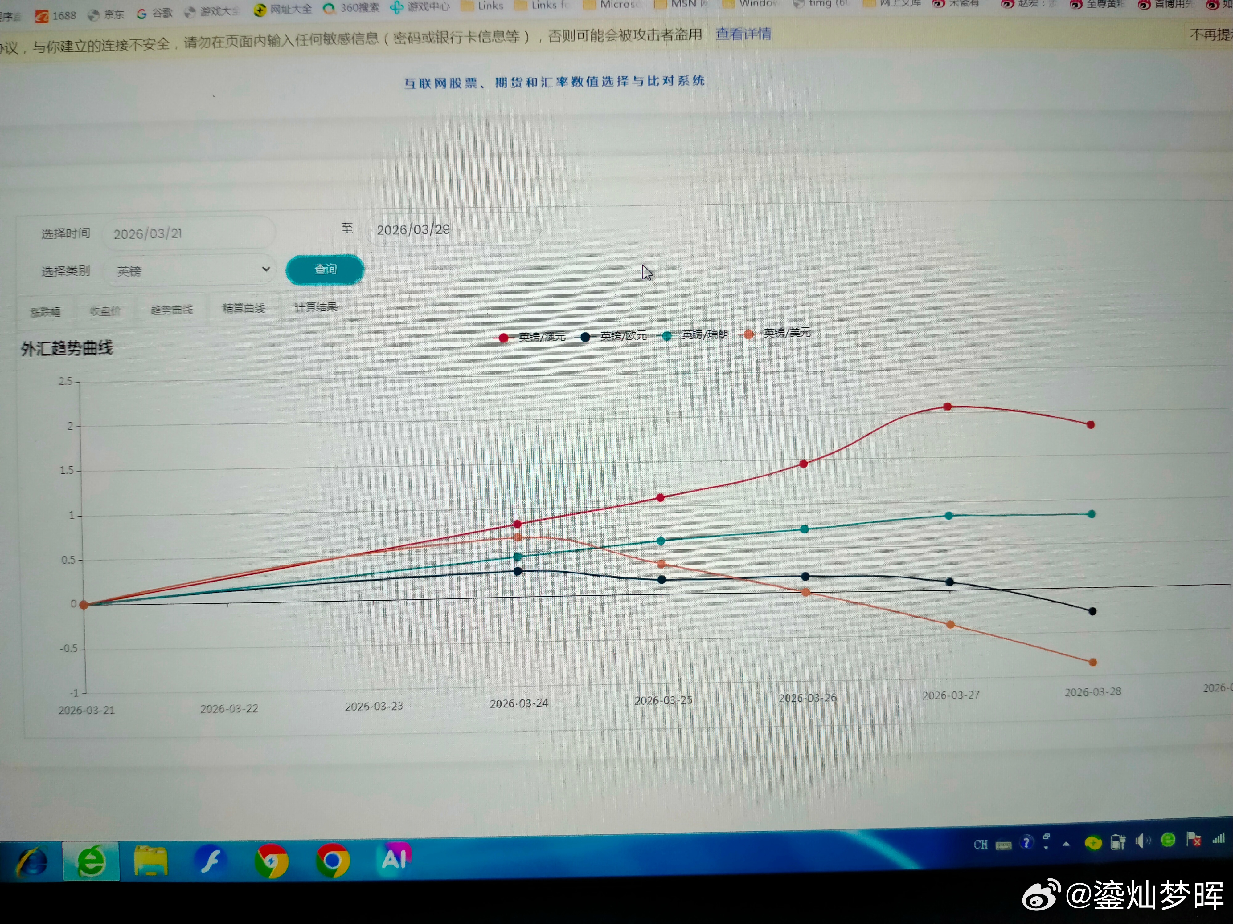 本周主要汇率走势 本周美元最强,澳元最弱。 图一是美元本周的涨跌幅曲线,除了周一下跌外,后面连涨了四天。图二是趋势曲线,兑其他几个主要币种都是上涨的。中东冲突升级和延续,都可能促使市场青睐美元。所以,估计会持续一下吧? 图三是澳元本周的趋势曲线,澳元终于下跌了。相对来说,澳洲可能受冲突影响会大一点。澳元在高位震荡了一段时间了,跌一下可能会更安全一点。 图四是欧元本周的趋势曲线,图五是英镑本周的趋势曲线,图六是瑞郎本周的趋势曲线,如果冲突延续,欧洲三个主要币种可能都不会太强势。 图七是兑日元的趋势曲线,图八是兑加元的趋势,日元和加元算是比较强。但可能不会延续太久。因为不是主要的收益币种。 图九是正向和反向态势图,现在英镑在高位区域,还是要注意风险了。澳元进入低位区域,看看什么时候见底吧。