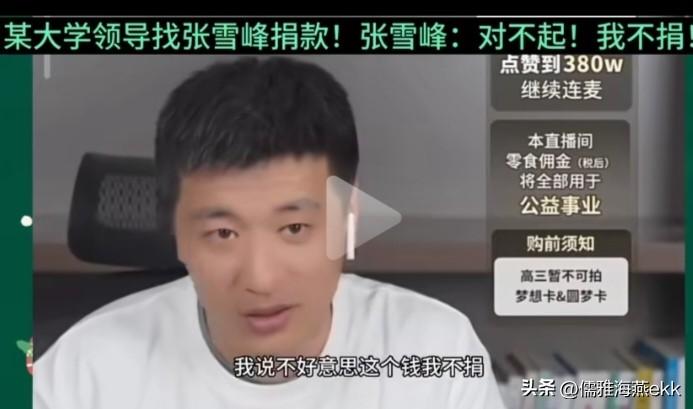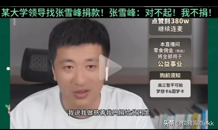 就喜欢这样的张雪峰!某大学找张雪峰给校基金会捐款,帮助出国深造的学生,张雪峰一口拒绝:对不起,我不捐,我捐钱只干一件事——帮助贫困生 张雪峰老师说,曾经有所大学的领导找到他,说张老师喜欢做慈善,让他给他们学校也捐点款。 张雪峰老师没有犹豫,说,那好,你把你们校贫困生的资料给我,我要看你们校有多少贫困生? 这位领导说,贫困生属于学校另一个部门管,我想你给我们校基金会捐款。 张雪峰老师说,不好意思,我不捐,我做慈善只捐给贫困生,捐给那些想通过学习改变命运的贫困生。 那位高校领导说,我们基金会也是帮助学生有更好的未来,资助那些学习能力强的学生出国深造。 张老师说,我宁可这是他父母的事,不是我的事。我捐钱只干一件事——帮助贫困生,捐给别的,这些钱干啥了也不好说,到底怎么用的?能不能用到真正需要的人身上,我也不好监管。 其实,对于这所高校是多好的帮助贫困生的机会,但此校没这份心,白白的错过了,张老师拒绝是对的。 我认为张老师做得很对,你没钱吃饭,我可以帮;你没钱吃肉,自己想办法。 就喜欢张老师这种,让他趋炎附势,他不会;让他看人下菜,他不会;让他嫌贫爱富,他不会;让他摈弃穷人,更不会——刻在骨子里的善良,刻在骨子里的高傲! 他曾说,不是说我要去挣多少钱使自己幸福,而是我能帮助很多人,我感觉自己很幸福。我要给女儿树立榜样,虽然她现在没这个意识,若干年后,得知爸爸的行为,女儿也会成为像他一样的人。 张老师走了,带着他未竞的热爱的事业走了,大家记得他的好,自发的从四面八方赶来,万人排长队相送,这是用最高的规格对他的肯定,他将会永远活在大家的心中。