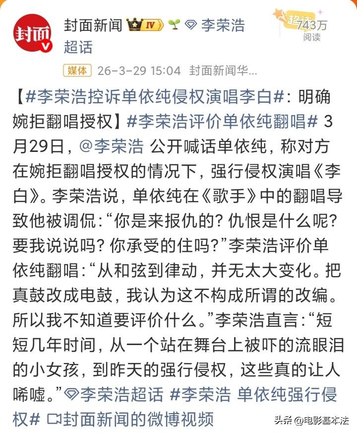李荣浩真霸气,丝毫不给单依纯面子,直接社交平台公开指责单依纯“强行侵权”。 更厉害的是,李荣浩直接“截断”了单依纯的后路,直截了当的表示不会接受单依纯事后有可能的“本人不知道,都是公司干的”借口,也不希望单依纯用落泪来博取同情,这些他都不会接受。 同样都是音乐工作者,为什么人和人相差这么大,尊重版权是行业底线,任何人想在这行长远发展,就必须尊重版权,否则迟早被行业和市场抛弃,市场需要创作者,不欢迎侵权者!