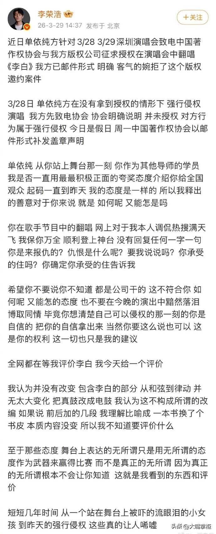 歌手单依纯强行侵权,这也太胆大包天了吧? 3月29日,李荣浩发长文,公开曝光单依纯在28日演唱会现场,在李荣浩方明确拒绝单依纯方版权邀约,在没有拿到李荣浩方授权的情况下,单依纯依然翻唱了李荣浩的《李白》,明晃晃地侵权,无所顾忌。 2025年6月,单依纯在《歌手2025》中,翻唱改编李荣浩的《李白》,凭借魔改的“如何呢,又能怎”火爆全网,当时节目组取得了这首歌演唱的基础版权,并没有取得改编权,对此,李荣浩今天明确表示,他当时对节目中歌曲的改编“未发一言”,但并不代表认可。 没想到,他的“未发一言”换来的,并不是单依纯方面的感激,而是当成了可以欺负的对象。 别的不说,在今天大家版权意识已经这么高的情况下,单依纯还做出这种行为,实在令人费解。 单依纯此举,是不怕李荣浩告她吗?还是说,她认为李荣浩会再一次“放”过她? 3月28、29两天,是单依纯深圳演唱会,长文中,李荣浩也说了, 不要在今晚的演唱会上扮可怜,博同情,更不要说你不知道,是公司在协作等,字字句句,没有给单依纯留一点面子。 站在李荣浩的立场,也的确是生气,见过脸皮厚的,没有见过脸皮这么厚的,如今这件事已经上了热搜,单依纯方面还没有发声,今晚演唱会的歌单肯定也会变,不知单依纯会怎么解释这次侵权行为,有关方面又会有怎样的处罚措施,大家一起拭目以待。