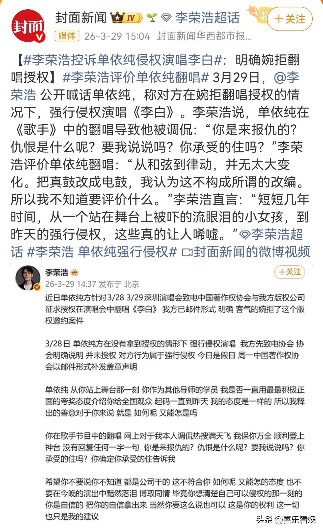 单依纯,没想到吧? 3月29日,单依纯估计怎么也没料到,曾经在节目里一直护着她的李荣浩,会直接发长文把她侵权唱《李白》的事摆到台面上,这波操作真的让人意外。 事情要从演唱会授权说起:单依纯方为了3/28、3/29的深圳演唱会,特意找了中国著作权协会和李荣浩的版权公司,想翻唱《李白》,李荣浩这边也没绕弯子,直接用邮件客气地婉拒了这个邀约。 谁知道3月28号演出当天,单依纯方在没拿到任何授权的情况下,居然强行唱了《李白》。 李荣浩先打电话给协会确认,协会明确说根本没给授权,这就是实打实的侵权行为。 李荣浩直言称:从单依纯站在舞台上开始,自己作为导师,一直用最积极正面的态度夸她,把她介绍给全国观众,直到昨天态度都没变过。 他还提到之前单依纯在《歌手》里翻唱《李白》,网上全是调侃他的热搜,他都没说过一句话,全力保单依纯顺利登上神台。 结果现在换来的是对方强行侵权,这让李荣浩忍不住质问:“你是来报仇的?仇恨是什么呢?要我说说吗?你承受得住吗?” 能看得出来,李荣浩是真的很生气。 他还戳破了单依纯在舞台上的“无所谓”,说那只是用来赢比赛的武器,不是真的无所谓,真正的无所谓根本不会让人知道。 这事一出,网友们也炸了锅,有人直接吐槽:“天呐,早就该说了,她的这首改编歌真的影响了很多学生,导致那些学生一天天不管自己做了什么都说那咋了又能怎?” 还有人更直白:“告死她,唱的太难听了”,看得出来大家对这事儿也挺不买账的。 单依纯这波是真的没想到吧,曾经被李荣浩一路护着的学员,现在因为侵权被公开指责,连网友都不站她这边。 以前大家觉得她是被照顾的怯场小女孩,现在却因为版权问题翻了车,这变化真的让人唏嘘。 果然在版权这件事上,再深的情分也不能越界,一旦碰了红线,谁都不会惯着。 对此,你们怎么看?