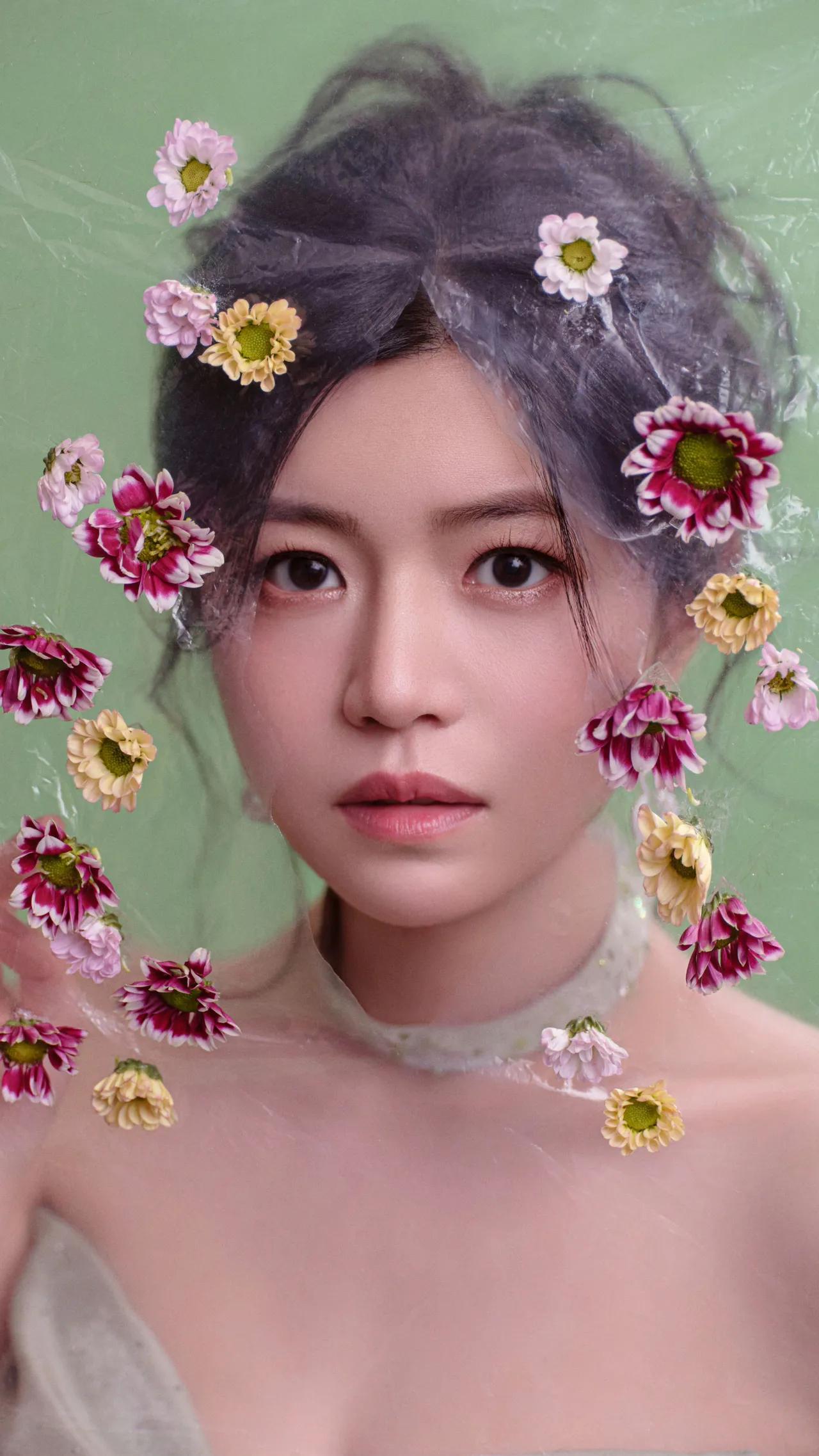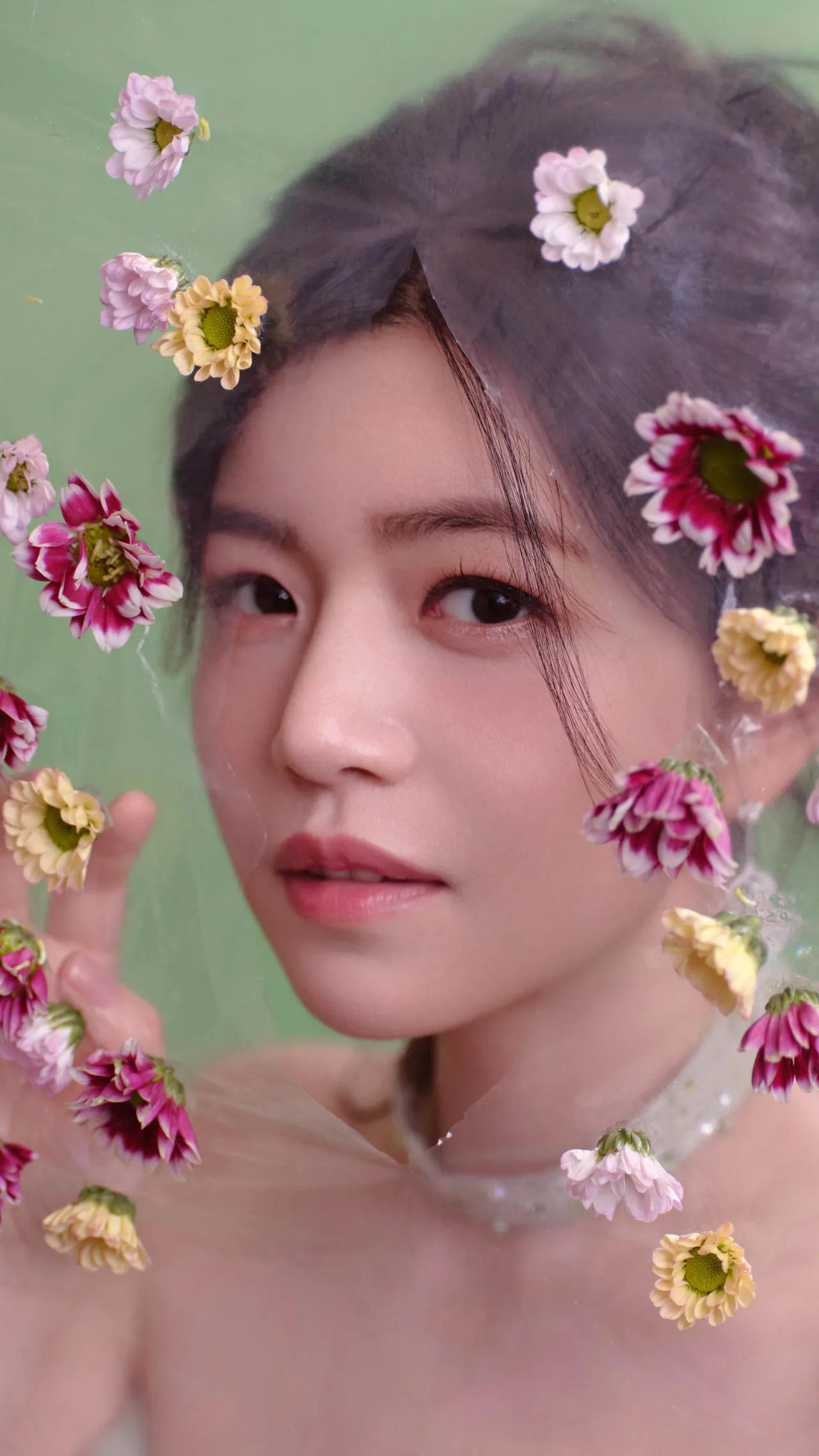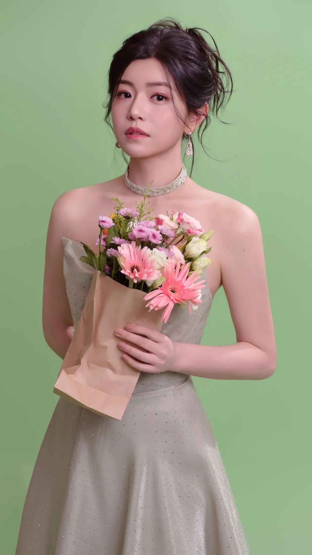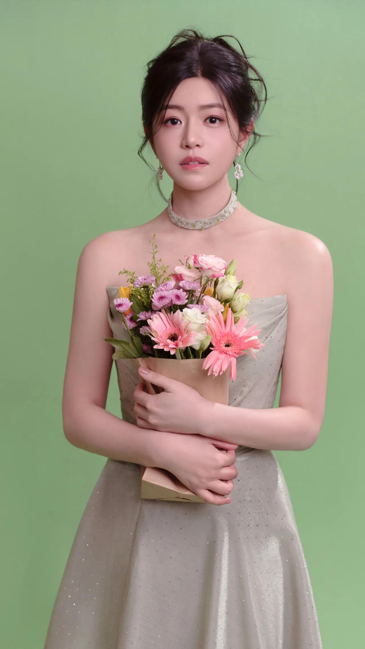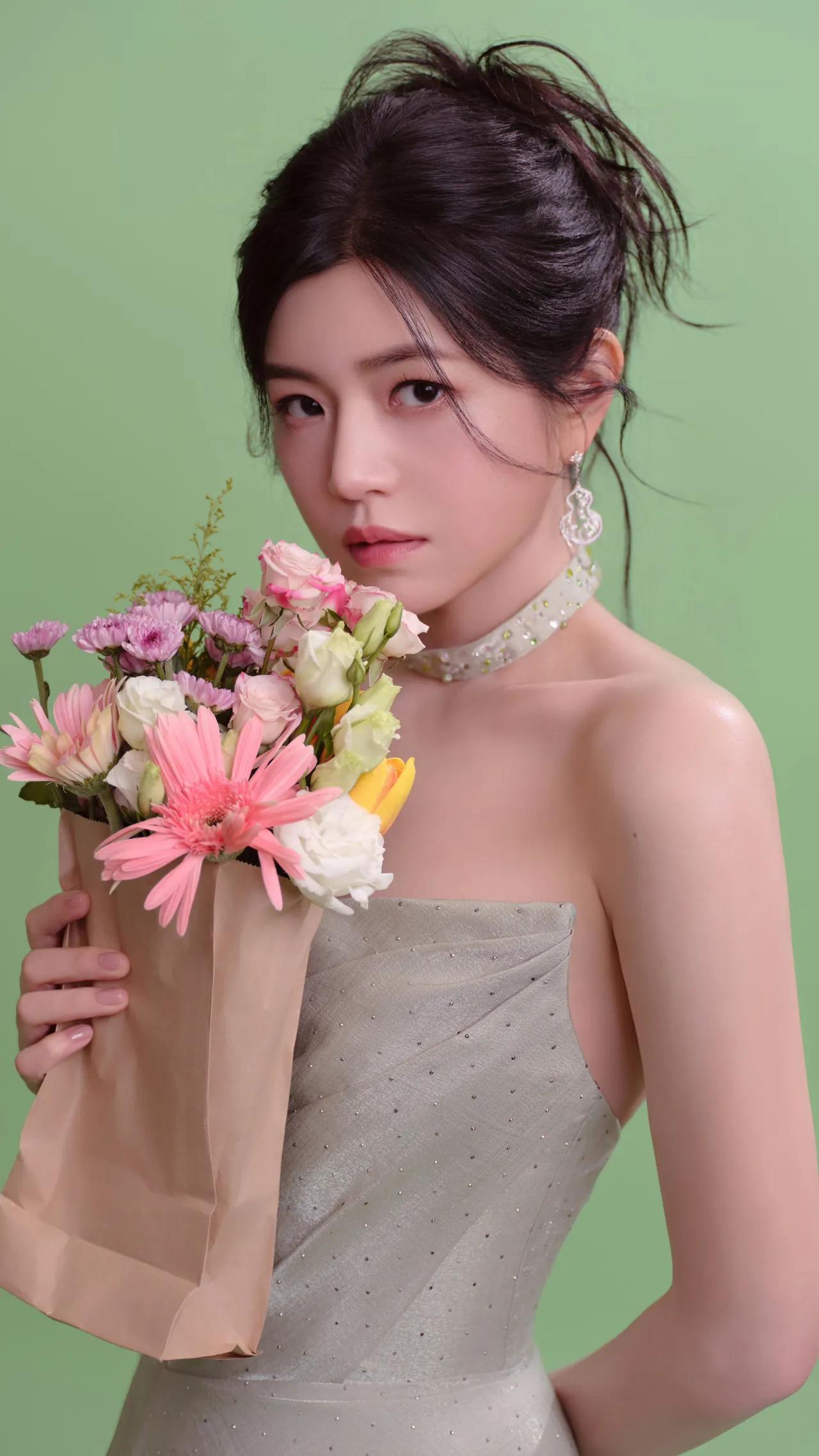 美女壁纸~陈妍希,薄荷绿的底色里,藏着一整个春天的温柔。手捧花束时,是少女与春日的私语