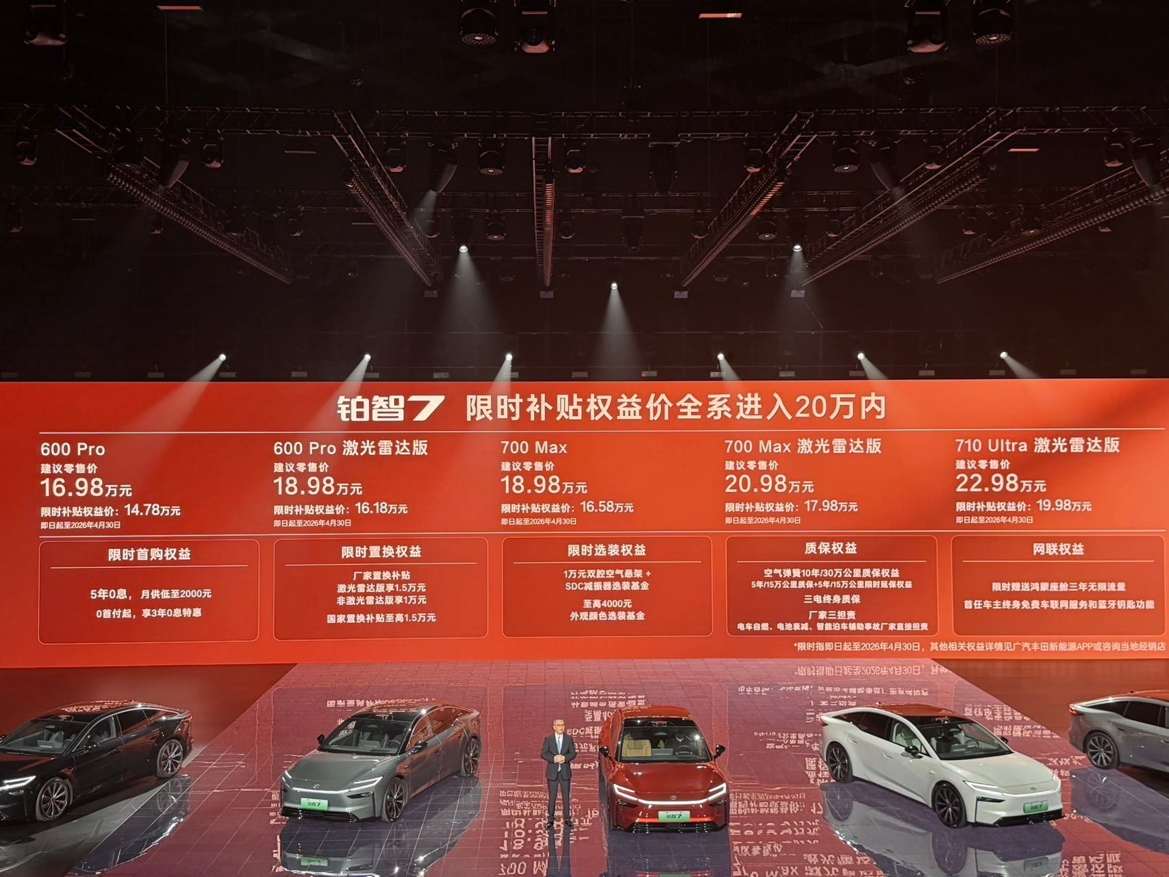 广汽丰田铂智7正式上市,限时补贴权益价:600 Pro版:14.78万600 Pro激光雷达版:16.18万700 Max版:16.58万700 Max激光雷达版:17.98万710 Ultra激光雷达版:19.98万新能源时代的丰田服务2.0,底层打通+联合标定+体系融合,不说了等我的提车视频吧~铂智7上市限时补贴权益价14.78万起丰田铂智7限时补贴权益全系20万内