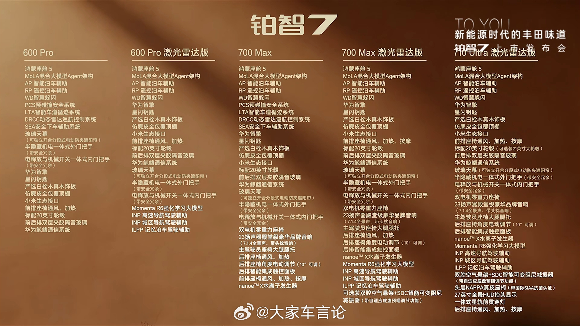 广汽丰田铂智7正式售价公布 14.78万起,首购5年0息政策,限时补贴权益后全系进入20万元内。600 Pro版 14.78万、600 Pro激光雷达版 16.18万;700 Max版 16.58万、700 Max激光雷达版 17.98万;710 Ultra激光雷达版 19.98万。