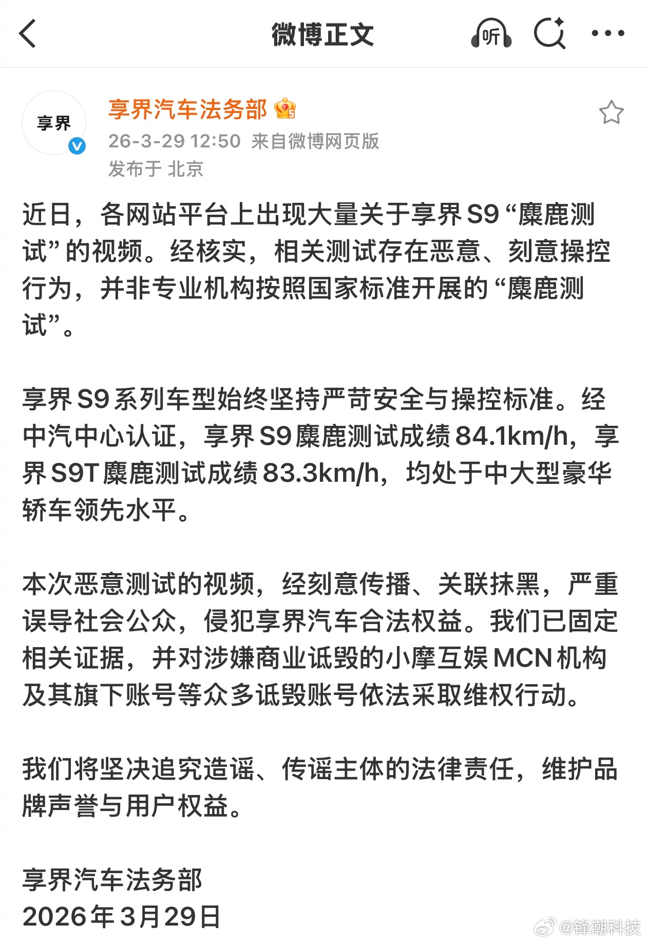 享界法务部:近期网上大量关于享界S9“麋鹿测试”的视频,经核实,相关测试存在恶意、刻意操控行为。