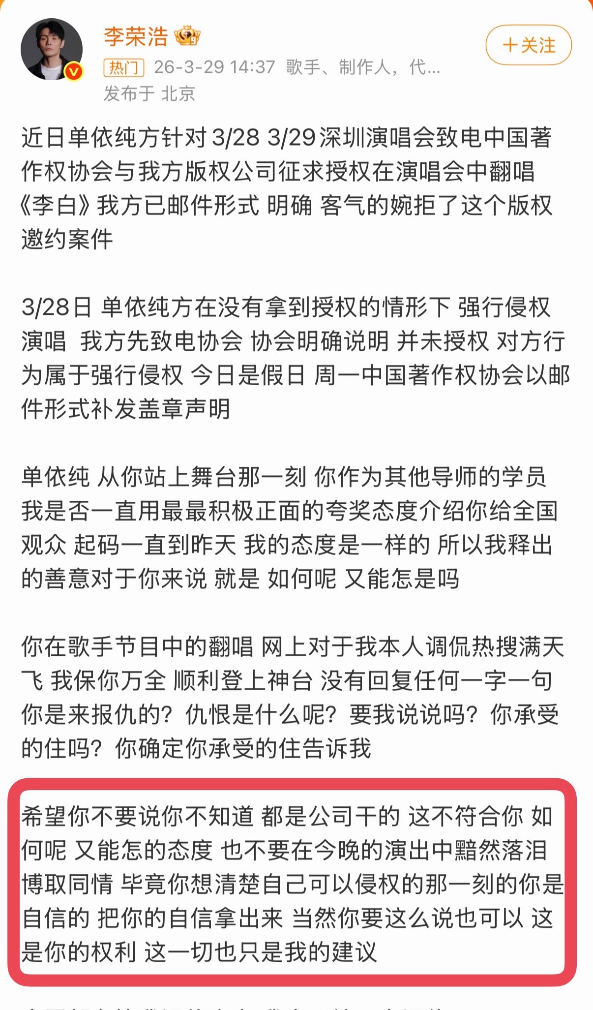 李荣浩太强了,直接预判了单依纯的回应!单依纯称不了解情况,在和团队沟通。歌都唱完了,有没有授权她居然不知道?你们信吗?