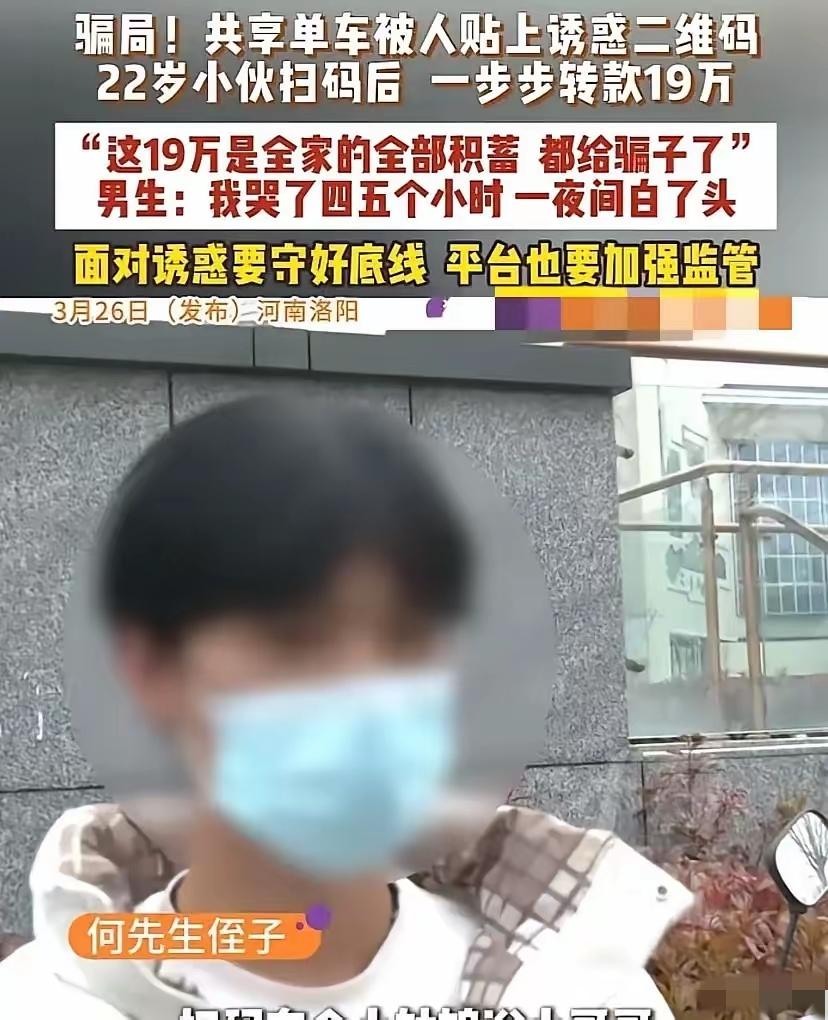 太寒心!河南洛阳一名22岁小伙在路边扫共享单车时,看到车身上贴着“同城找小姐姐”的小卡片二维码,出于好奇扫了码,结果被对方一步步套进骗局,十几个小时里连续转账几十次,最后被骗走18万9千8 小何刚毕业,父母攒了二十年的血汗钱本是他的婚房首付,就因为一时好奇扫了码,结果被骗子套牢。对方一句“钱能退”,就让他在十几小时里转了几十次账,最后等来的却是拉黑,买房梦直接碎成渣。 别觉得这种事离自己远,骗子就是专挑路人的侥幸心理下手。街头那些暧昧小广告,从来不是桃花路,而是吸金坑!年轻人涉世未深,更得擦亮眼睛,天上不会掉馅饼,掉的都是陷阱。 你平时见过这类街头小卡片吗?遇到了会怎么处理?