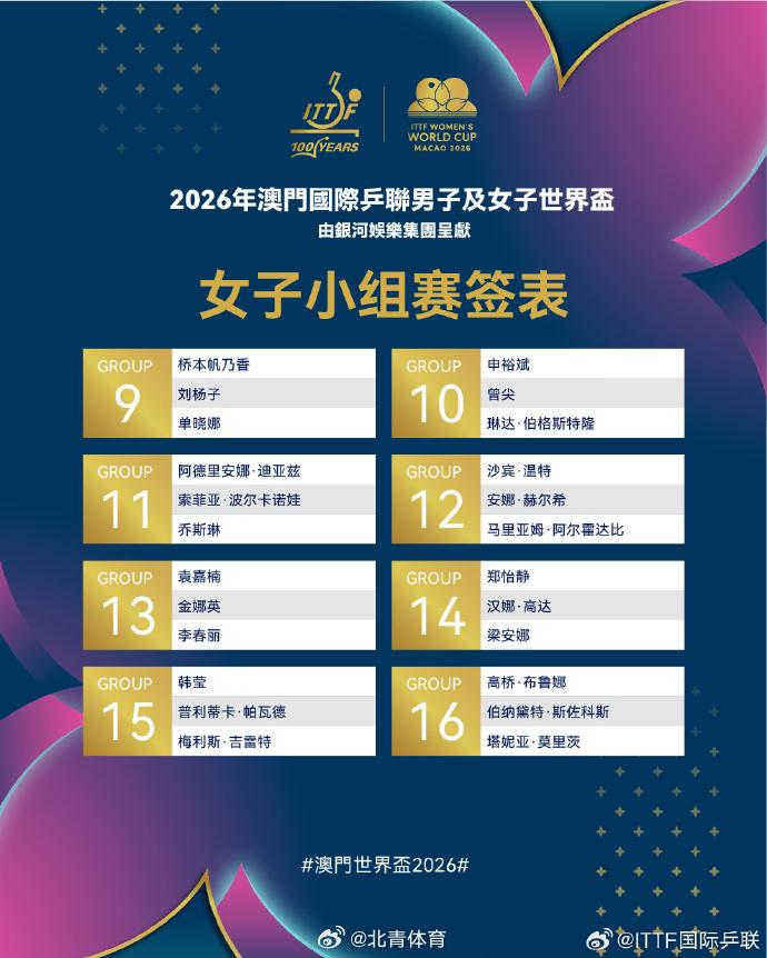 小组赛签表出炉 梁靖崑与奥恰洛夫同组 3月29日下午,2026年澳门国际乒联男子及女子世界杯小组赛签表正式出炉。女单方面,头号种子孙颖莎分在一组,她小组赛的对手分别是埃及选手蒂娜·梅谢芙,以及来自中国台北的球员李昱谆。男单方面,王楚钦作为头号种子,被分在了第一组,同组对手是澳大利亚选手卢伟和罗马尼亚的爱德华·约内斯库。 2026年澳门国际乒联男子及女子世界杯将于30日启幕,本届赛事汇聚48名男子及48名女子世界顶尖乒乓球运动员逐冠军殊荣。比赛分为两阶段,第一阶段球员将被分成16组,每组三人,进行单循环赛。第1至第4号种子分列小组1至小组4,其余球员按照调整的蛇形排列四人一组抽签决定签位,同一协会的选手将不会分至同一小组。第一阶段采用五局三胜制,每组排名最高的球员进入第二阶段淘汰赛,淘汰赛将采用七局四胜制。本届世界杯,国乒男队派出王楚钦、梁靖崑、温瑞博、周启豪、陈垣宇5人参与男单角逐;女队则由孙颖莎、王曼昱、陈幸同、蒯曼、王艺迪、覃予萱6人出战。 根据抽签结果,女单头号种子孙颖莎被分在了第一组,同组的对手有埃及选手蒂娜·梅谢芙和中国台北的李昱谆。这两名球员的实力与孙颖莎相比存在明显差距,该小组的出线形势相对乐观。孙颖莎接受采访时表示,从小组赛开始就一场一场去拼,因为能够来到世界杯的球员都是各大洲的优秀选手,自己的目标是全力打好并享受每一场比赛。 二号种子王曼昱被分在第二组,对手是印度选手阿库拉和葡萄牙选手付玉,两人整体实力不算突出,王曼昱出线没有太大问题。陈幸同位于第三组,同组对手为中国台北的叶伊恬和罗马尼亚的德拉戈曼,竞争压力同样不大,晋级之路预计会较为轻松。蒯曼被分在第七组,同组对手有美国的王艾米和法国的卢茨。王艺迪则被分在第六组,与她同组的是中国香港的杜凯琹和波兰选手巴约。年仅19岁的小将覃予萱被分在第五组,她接下来将面对日本名将早田希娜以及德国选手考夫曼,小组赛的挑战比较严峻。 男单方面,王楚钦被分到了第一组,同组的有澳大利亚的卢伟和罗马尼亚的约内斯库。王楚钦在接受采访时谈及本届世界杯参赛心态:“希望目前的自己能专注于比赛、享受比赛,并且能在每一个比赛当中发挥出最好的水平。” 日本选手张本智和与澳大利亚的林文政、波兰的雷德齐姆斯基同处第四组。梁靖崑被分在第九组,同组的有德国名将奥恰洛夫和阿根廷的西富恩特斯。年轻小将陈垣宇面临不小挑战,他将对阵德国强手邱党以及澳大利亚的舒迪恩。周启豪所在小组中则有德国的弗朗西斯卡和日本的川上流星。温瑞博与比利时选手西蒙·高茨、乌瓦切被分在第十五组。 文/北京青年报记者 周学帅