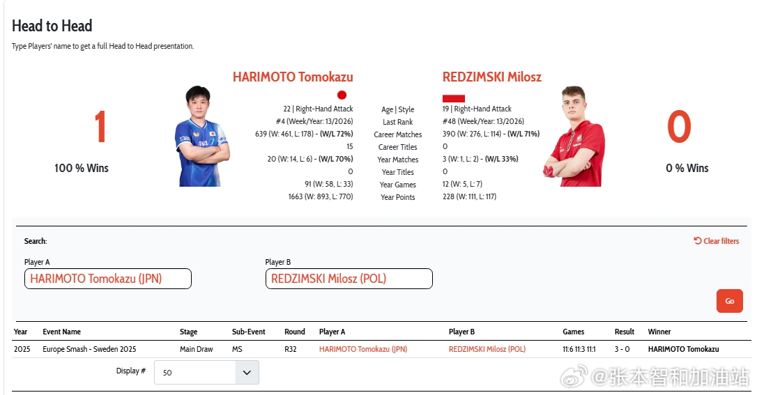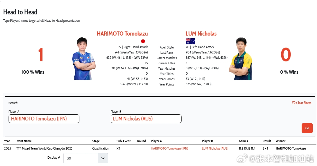 2026澳门乒乓球世界杯张本智和 男单第4组:张本智和、林文政、米洛什·雷德齐姆斯基。头对头:张本智和1-0林文政 (25混团,2-1,2-104);张本智和1-0米洛什 (25瑞满,3-0,631);林文政0-0米洛什。