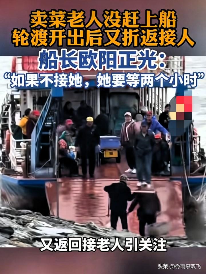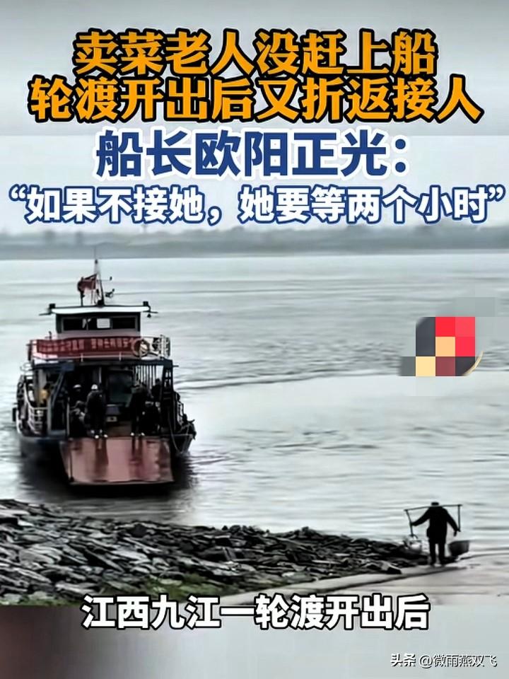 江西九江,轮渡已驶离码头十余米,船长欧阳师傅一个回头,让无数人瞬间破防。 九江的一个渡口,欧阳师傅在那里开了十多年的轮渡。 其实,他开这个轮渡并不赚钱,搭渡轮的人以老人居多,而他对于往返两岸的老人只收单程费。 家里儿女早就让他不要那么辛苦了,但是欧阳师傅丢不开那里来来往往两岸的人。 他说,按照他现在的身体状况来说,他还可以再干几年。 那天,欧阳师傅的船已经开离码头十多米远了,却看到后面一个老人挑着一担菜,一边小跑步,一边使劲地招手。 老人年纪大了,虽然看起来篮子里的菜不多,但是肩还是被扁担压得弯得厉害。 欧阳师傅认识这个老人,家里比较困难,一年到头都靠在地里种一些蔬菜卖了维持生活开销。 而当时又下着小雨,老人如果错过这一趟,就要等两个小时后才能坐上船。 要真的那样的话,不但老人篮子里的菜,过了早上贩卖的高峰期,可能会卖不掉;而且老人有可能被淋湿一身,受凉感冒。 老人菜没卖出去,反而要花钱买药,“布扯两头缩”,太难了。 于是,欧阳师傅又调转头接上老人一起走。 有人问欧阳师傅为什么要折返,他很实在地说,如果是年轻人我就不接了,老人不容易,能帮一把就帮一下。 这温暖的一幕被人抓拍到,然后分享到网上,几十万的点赞评论。 “支持欧阳师傅,咱们九江的正能量。” “欧阳师傅好人会有好报。” 这么普通的一件小事,为什么反响那么大? 我想是因为这份不带功利的普通人之间的温暖互助,最戳人心吧。 欧阳师傅自己也没赚多少钱,但是他宁愿多耗十几元油费,也要让老人能够及时赶去卖菜。 他身在烟火日常,更懂人间疾苦,所以愿意在自己能力范围内,给别人撑一把伞、照一束光。 这世上最动人的从不是惊天壮举,而是凡人自带的微光。 一个普通人,凭着善念本心帮另一个普通人,没有掌声,不求回报,却比任何豪言壮语都更有力量。 正是这一点点不起眼的善意,撑起了人间的温度,也让我们相信:平凡人的善良,最珍贵,也最有力。 凡人微光 正能量