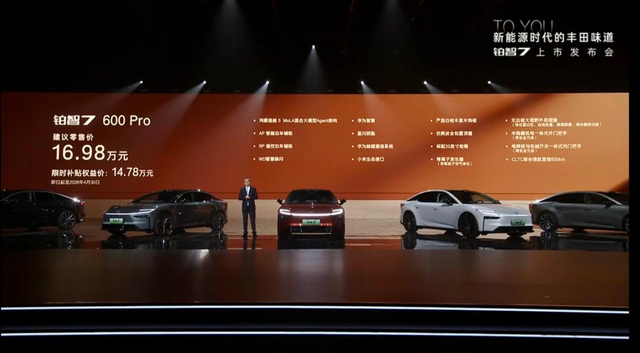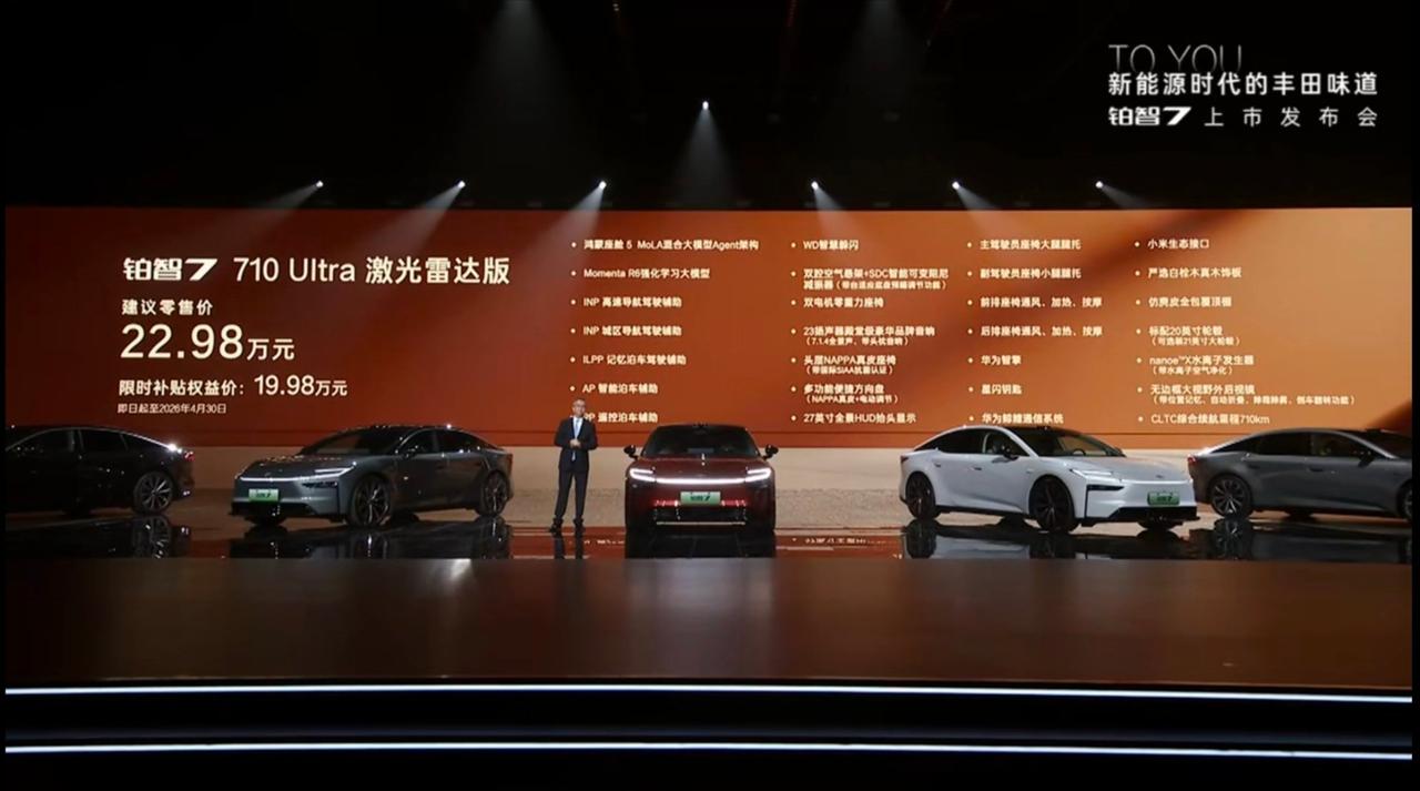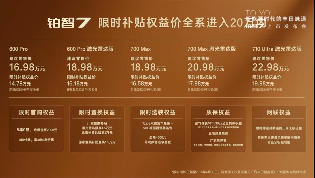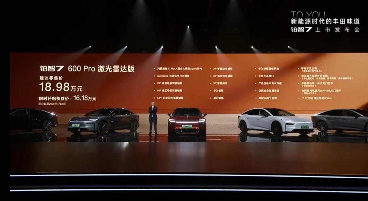 全新丰田铂智7上市了 尺寸:5130*1965*1506mm,轴距:3020mm(D级轿车) 驱动形式:纯电 电机功率:207kW 纯电续航:600-710km 电池容量:71.35-88.13kWh 电池类型:磷酸铁锂 底盘:前双叉臂后多连杆+双腔空悬+SDC 轮毂尺寸:20/21寸 智能辅助:Momenta R6 智驾硬件:激光雷达*1/12*超声波雷达/13*摄像头 智能座舱:鸿蒙座舱5 屏幕:8.8仪表屏+15.6中控屏+HUD 行李箱容积:410L 外观颜色:红/白/灰/金/翠/黑/银 内饰颜色:灰/紫/棕 座舱:内饰全软皮包覆/前后排车窗双层夹胶玻璃/无边框车门/半隐藏门把手/超长扶手 座椅:真皮Nappa/副驾零重力座椅+小腿托/副驾后排小桌板/全车加热+通风+按摩/一键小息 其他:二段式遮阳帘/冷暖冰箱/香薰系统/雅马哈23扬声器/小米车载硬件(屏幕) 16.98万 600Pro 600续航/20寸轮毂/12扬声器/前排50W无线充/前排通风加热/仿麂皮顶棚/玻璃天幕+遮阳帘 18.98万 600激光雷达版 激光雷达/INP高速+城区驾驶辅助/行车记录仪/前后排双重夹胶玻璃/Momenta智驾 18.98万 700MAX 副驾零重力座椅/前后排座椅通风加热/700Km续航/双腔空悬/20寸轮毂 主副驾腿托/后排智能面板+后背调节/静音胎/后排50w无线充电/23扬声器 20.98万 700MAX激光雷达版 激光雷达/记忆泊车/R6 学习大模型/行车记录仪/Momenta智驾 22.98万 710Ultra激光雷达版 Nappa头层真皮座椅+后排按摩/多功能真皮方向盘/双腔空悬+SDC/27寸HUD PS:以上价格需要叠加国补+厂补(激光雷达1.5w/非激光雷达1w) 其他权益: 4999选装双腔空悬(700Max/700激光雷达版) 5年零利息 厂家补贴: 激光雷达版1.5万 非激光雷达版1万 国家置换补贴: 最高1.5万 所以要是能拿取所有补贴的话,价格是: 14.78万/16.18万/16.58万/17.98万/19.98万,这个根据地区不同,有不同的补贴价。 大家觉得价格怎么样呢?【来自懂车帝车友圈】