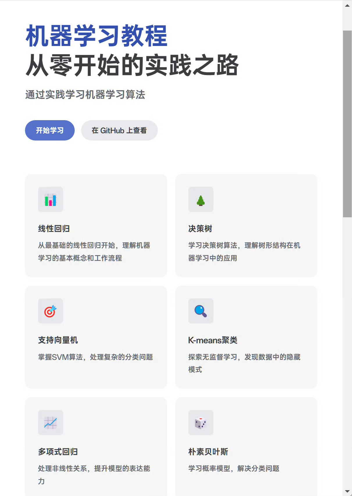机器学习教程 -- 从零开始的实践之路acgpp.github.io/simple-ml-code/本教程旨在通过实践的方式,帮助你理解和掌握机器学习的基本算法和应用。特点📝 详细的理论讲解💻 完整的代码实现🔍 丰富的实例分析📊 直观的可视化展示⚡ 即学即用的实践经验