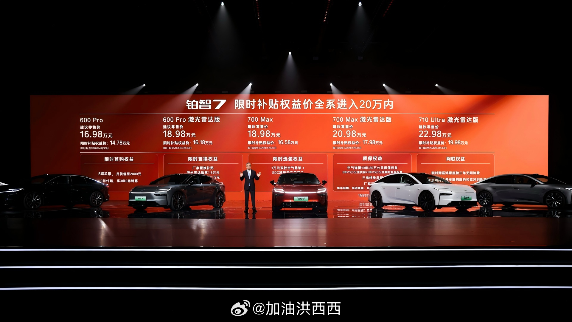 广汽丰田铂智7今日上市,限时补贴权益价14.78万-19.98万元,600/700/710km三档续航5款配置可选,上市即交付,预售阶段累计订单已破万。作为丰田首款搭载鸿蒙座舱的豪华旗舰大型纯电轿车,新车将D级车尺寸与双腔空悬、激光雷达智驾等高端配置下放,20万内即可集齐鸿蒙座舱、激光雷达智驾、双腔空悬三大核心配置。