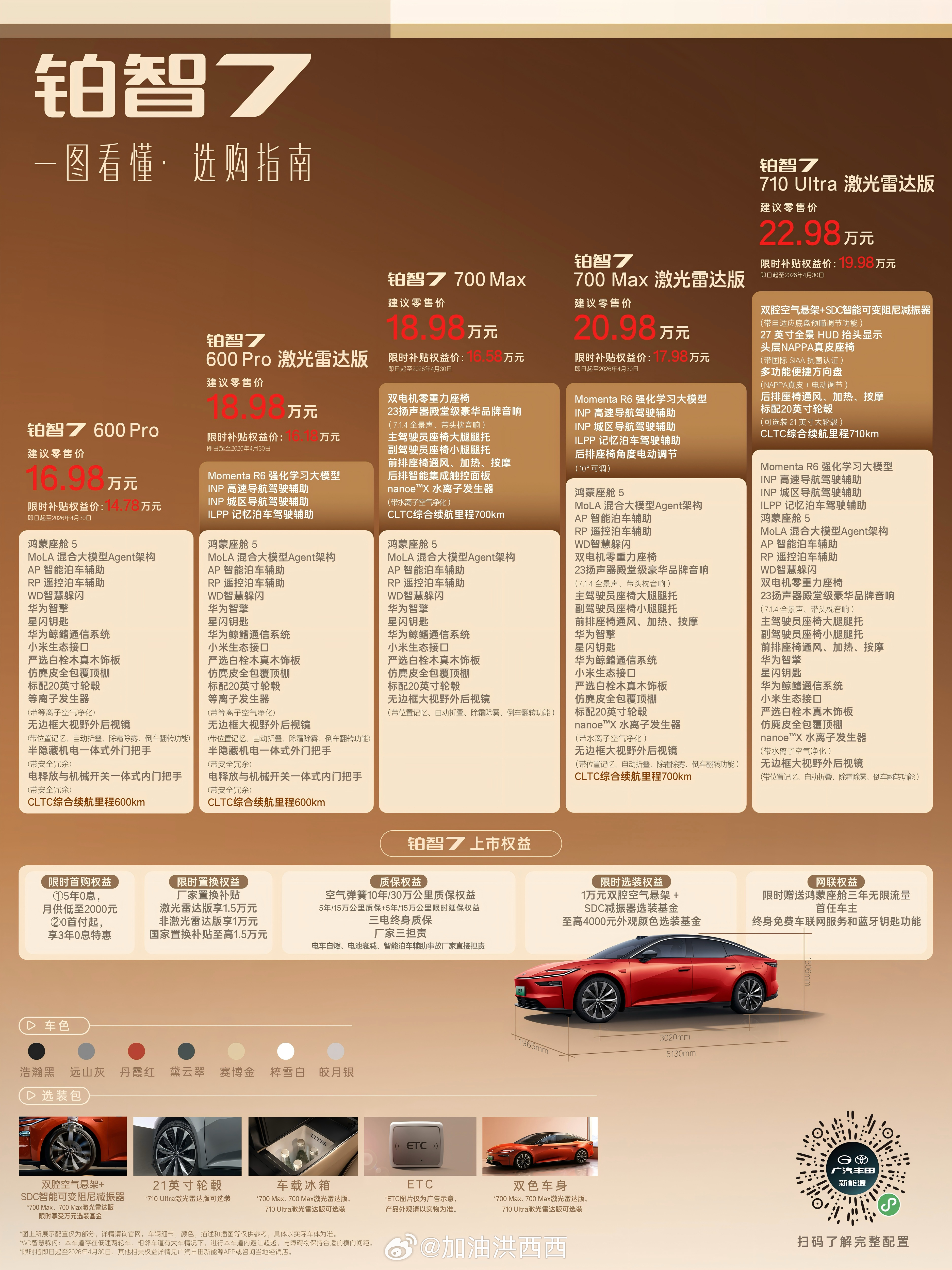 入门版600 Pro即标配鸿蒙座舱5、白栓木真木内饰、座椅通风加热、星闪钥匙等超15项豪华配置,17万级可拿下双腔空悬,顶配710 Ultra激光雷达版满配仅19.98万,还搭载27英寸全景HUD、NAPPA真皮座椅等配置。新车搭载华为智擎多合一电驱,电机最高效率97.5%,媒体实测常温续航达成率82%、低温60%,行业首创冬季续航守护行动,48小时出电池检测报告、72小时完成更换。