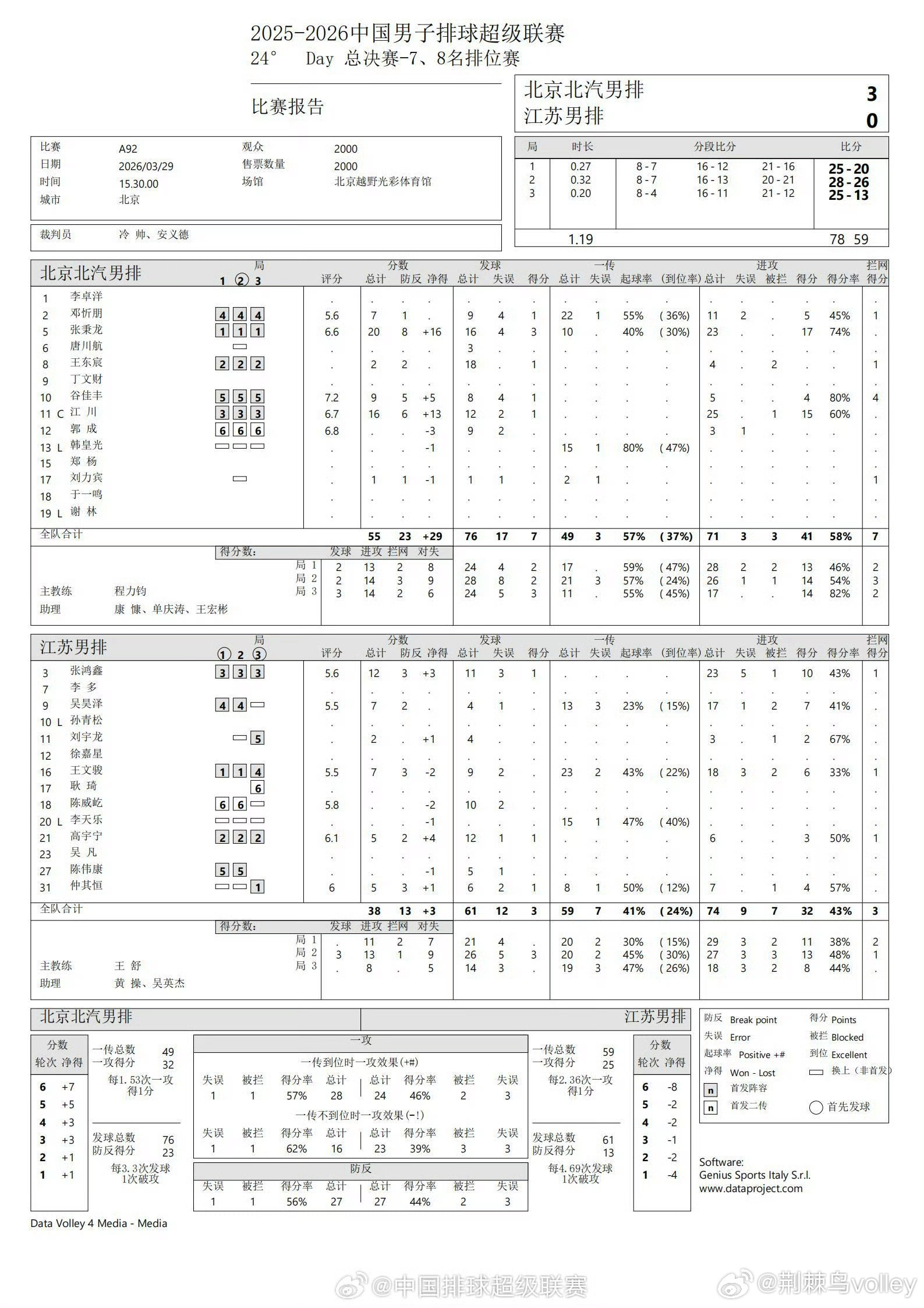 江川和张秉龙率领的北京男排主客场双杀年轻队员为主力的江苏男排成功保级。