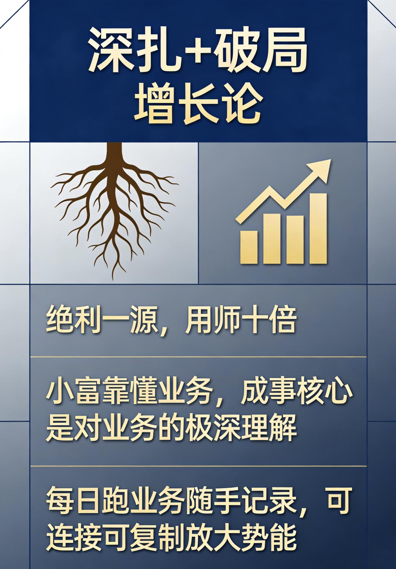 黄帝阴符经:“绝利一源,用师十倍。” 小富靠啥?懂业务。 现在能成事的, 核心一点就是对业务的极深理解。 现在能活下来的, 要么做得早资源厚有护城河, 要么核心壁垒与业务强。 没有不挣钱的生意,只有不挣钱的人。 有了武器,就是每日跑业务随手记录, 一路跑一路记直到“天长地久”。 如此不懂业务,也就懂业务了。 然后就是可连接可复制, 业务跑通了,由一点去放大势能, 这也需要业务工具提供支撑。 重复➕记录,改变的力量, 它本身就是与市场建立深度连接的过程。 这种日复一日的“熬”, 就是把流量转化为专属的私域认知资产, 这也是你最稳固的护城河。