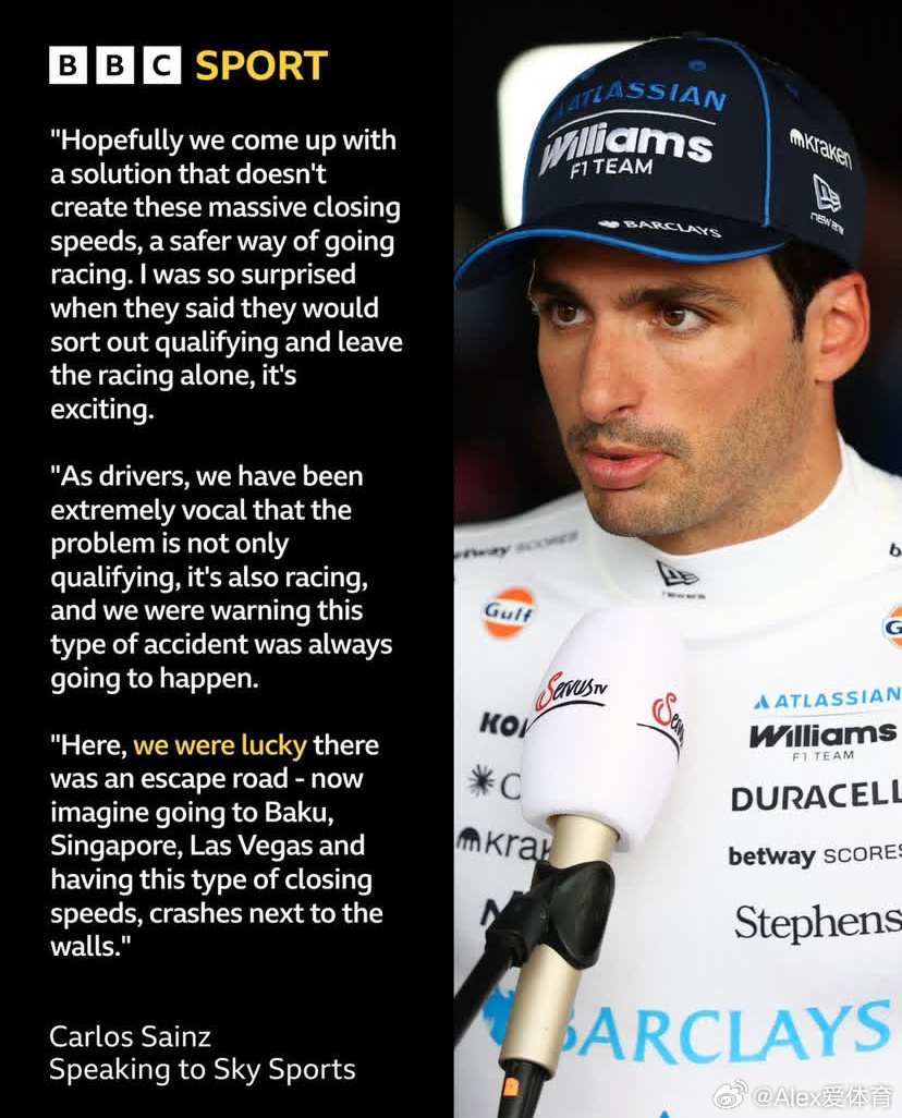 “这次我们算是幸运的,因为有一条逃生通道——但想象一下,如果在巴库、新加坡、拉斯维加斯,出现这样的速度差,在靠近护墙的地方发生碰撞,后果会怎样。”---这太危险了⚠️,还好熊男今天没事,否则FIA要被骂死了你们不能因为增加“无效超车”提高观赏性来扼杀对车手安全的保护贝尔曼撞车