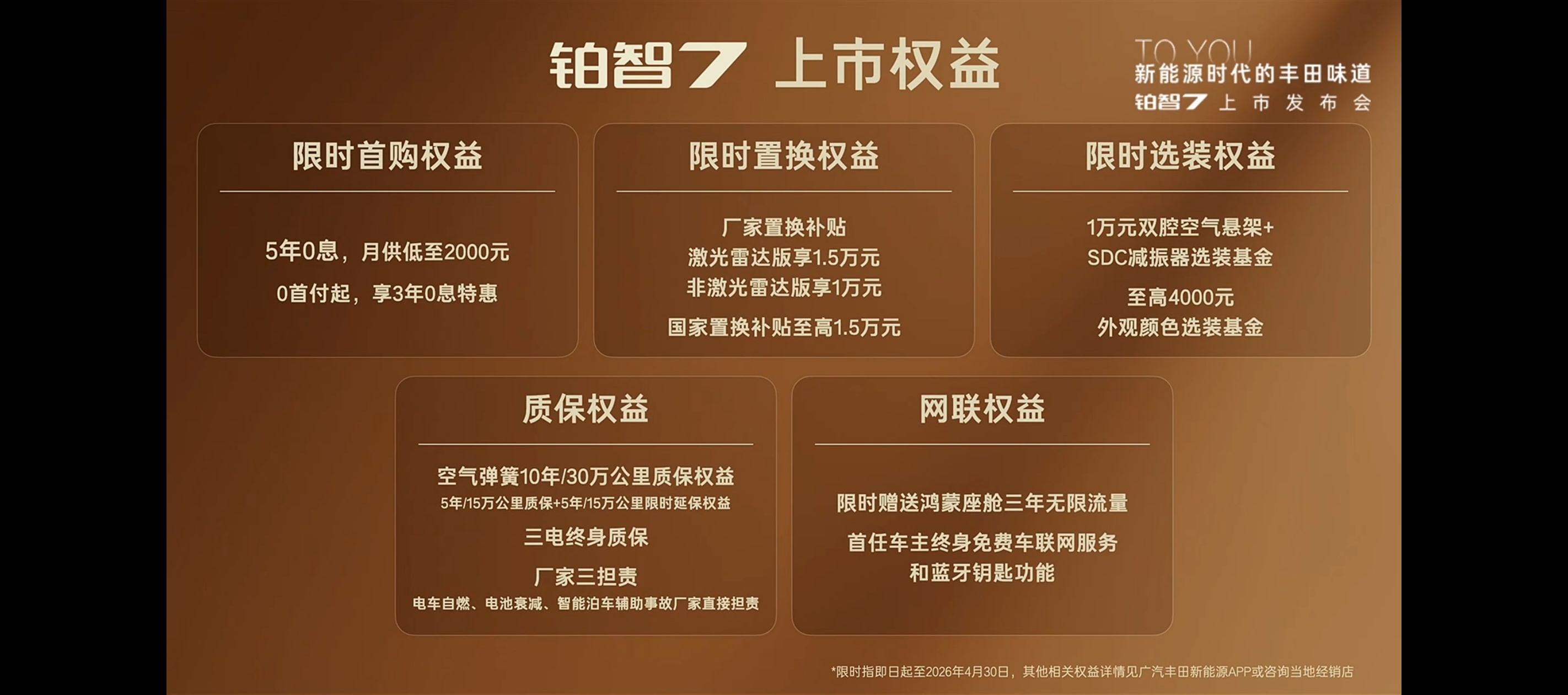 除了厂家的“三担责”(比如自燃,电池衰减等,详见图示),还有空悬质保10年/30万公里。所以你会发现,丰田很懂,知道大家买新能源车担心什么。尤其这个三担责,真心不错。