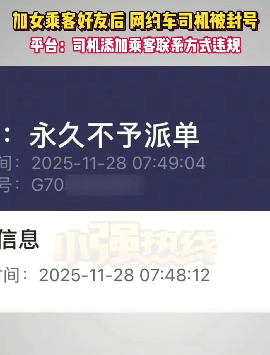 浙江杭州。 网约车司机凌晨接了一位KTV上班的女乘客,女子主动加了司机的微信,下午司机发现账号被永久封号。司机挺冤,不是主动加的也不行?司机申诉被驳回。 有的滴滴司机说,如果是乘客主动加微信,滴滴不会封号。肯定司机有其他问题,绝不会单纯因为顾客提出加微信而封号。 如果大家都添加了联系方式,下次就会直接联系,绕过平台更便宜。所以,只要有规定,还是按照规定执行的好。