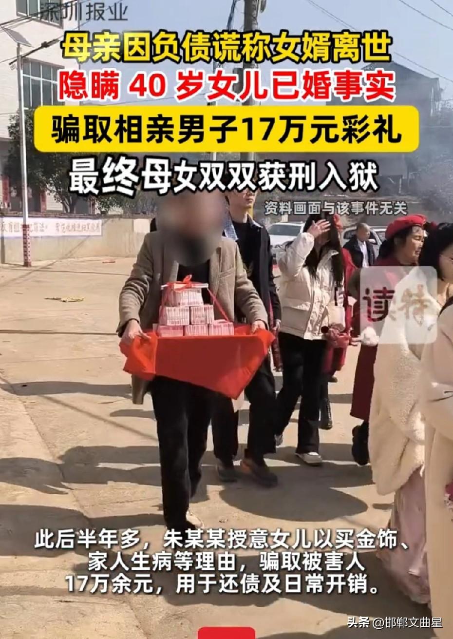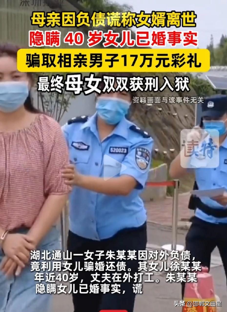 太缺德了!母亲为还债,与40岁已婚女儿合谋相亲骗17万彩礼 近日,湖北通山,一名母亲朱某某,为偿还外债,精心策划一场骗婚骗局。她明知女儿徐某某年近40、早已结婚、丈夫在外打工,却对外谎称丈夫去世、单身待嫁,托媒人介绍给单身男子华某某,并迅速与之敲定订婚。 母女俩分工明确、配合演戏:母亲负责谈条件、催要钱,女儿假意交往、稳住男方。短短半年,以买金饰、改口费、家人生病、赔偿损失等各种借口,先后向华家索要17万余元,骗来的钱全被用来还债和挥霍。 男方真心想成家,一次次掏钱满足,多次催婚都被对方找理由拖延,最后直接被拉黑,才惊觉从头到尾都是骗局,于是,男子愤怒地一纸诉状将母女告上法庭。 法院审理认定,二人以非法占有为目的,虚构事实、隐瞒婚史,数额巨大,已构成诈骗罪。最终母亲被判有期徒刑3年6个月,女儿被判1年10个月,赃款继续追缴返还被害人。 此事引发热议,有友说:把婚姻当敛财工具,联手骗老实人血汗钱,太缺德 还有网友说:明知女儿有家室还出来骗人,母女俩一起坐牢一点不冤 更有网友表示:骗婚必须严惩,不能让真心想结婚的人寒心 普通家庭挣钱不容易,娶媳妇彩礼动辄十几万,而这母亲明知女儿已婚,女婿在外打工,竟然谎称女婿死了,女儿单身,让媒人找男孩相亲,趁机骗取17万彩礼。 婚姻不该是诈骗的幌子,利用彩礼骗财,终究要付出法律代价!这下好了,一个三年六个月,一个一年六个月,母女俩老老实实在牢里踩缝纫机吧! 对此,大家怎么看?