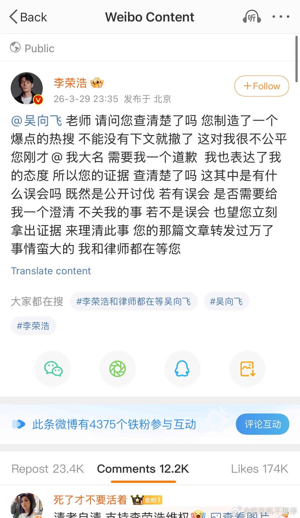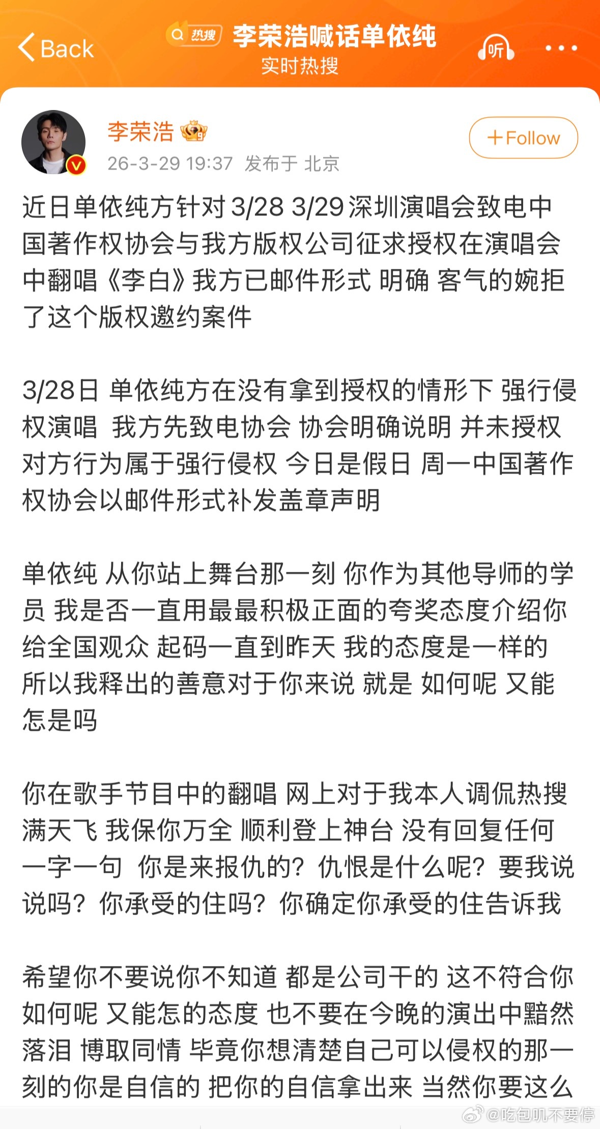 李荣浩4连质问单依纯中国版权意识确实薄弱,不仅是音乐版权,小说改编重灾区,郭敬明,于正还在娱乐圈活跃,不受影响…李荣浩有理有据,明星亲自下场真的比躲背后强多了。不愧是词曲创作者,说话非常有逻辑。完全预判了单依纯所有事后会做出的举动单依纯作为总监制不可能毫不知情。与其推打工人背锅,不如自己道歉,挽回口碑。她没有听李健的话,好好沉淀自己。吴向飞感觉蹭热度的,一直没有回应李荣浩。但李荣浩明显认真对待了,和律师摩拳擦掌吴向飞喊话李荣浩道歉