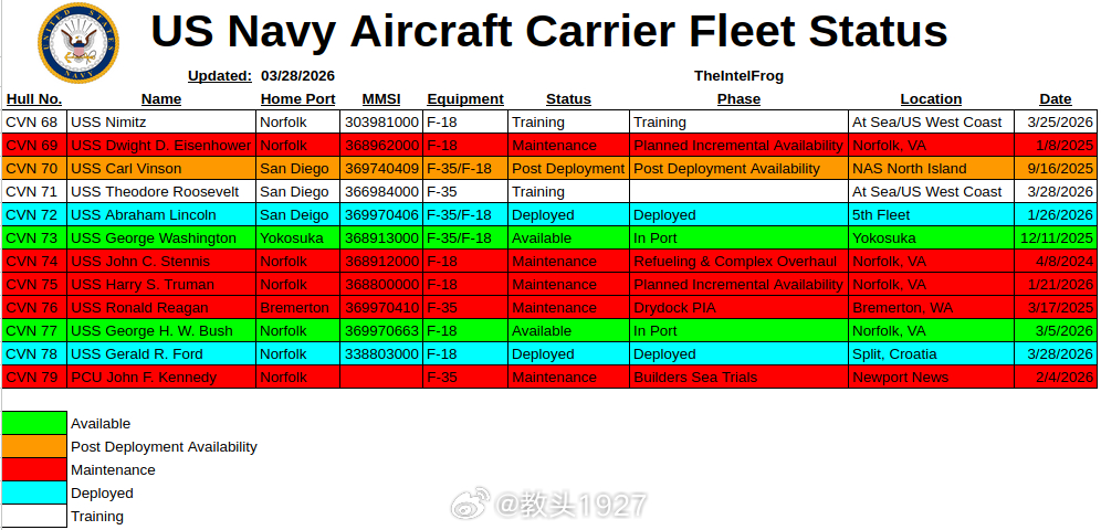 𝕏网友统计的美国航母当前状态