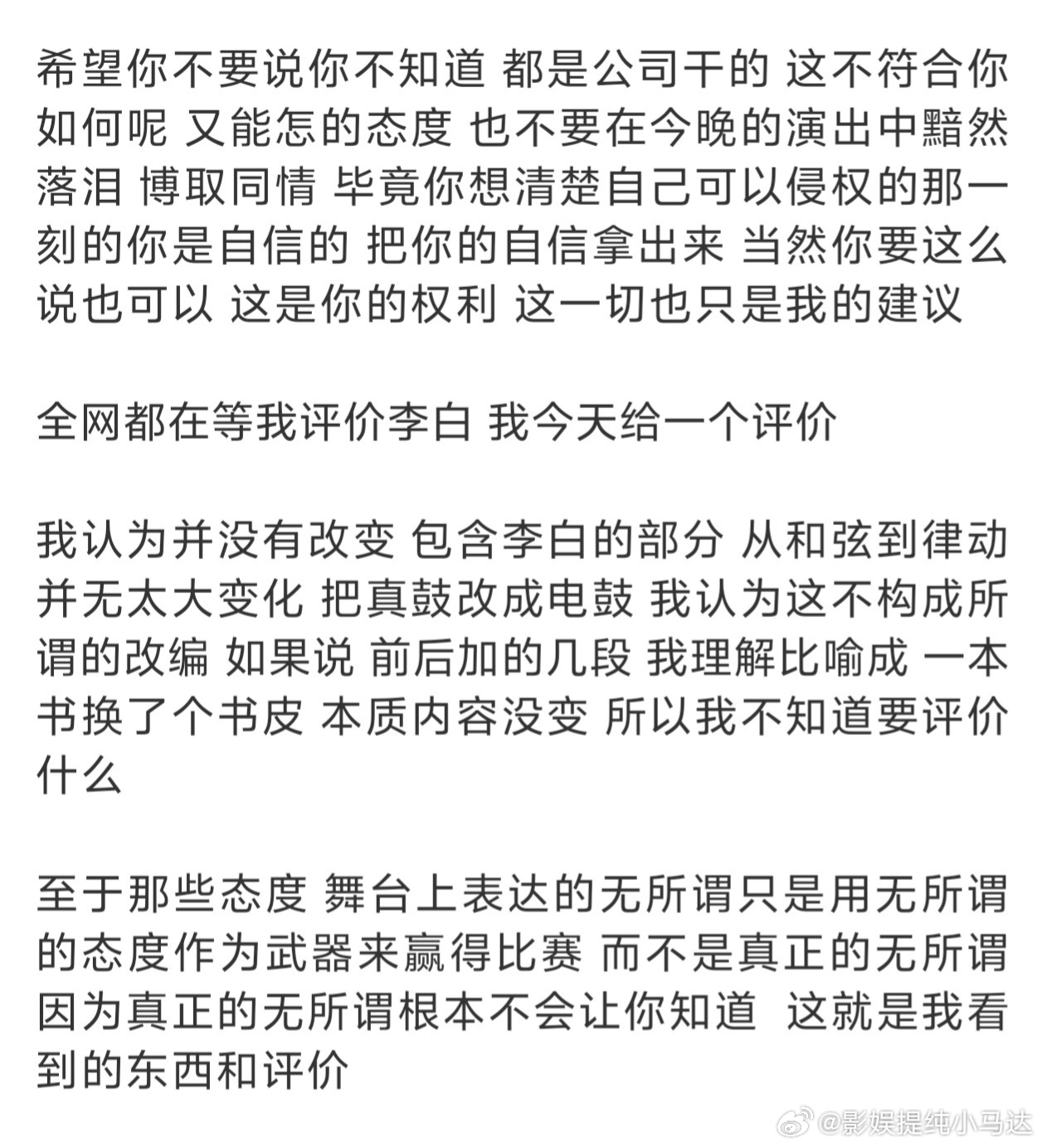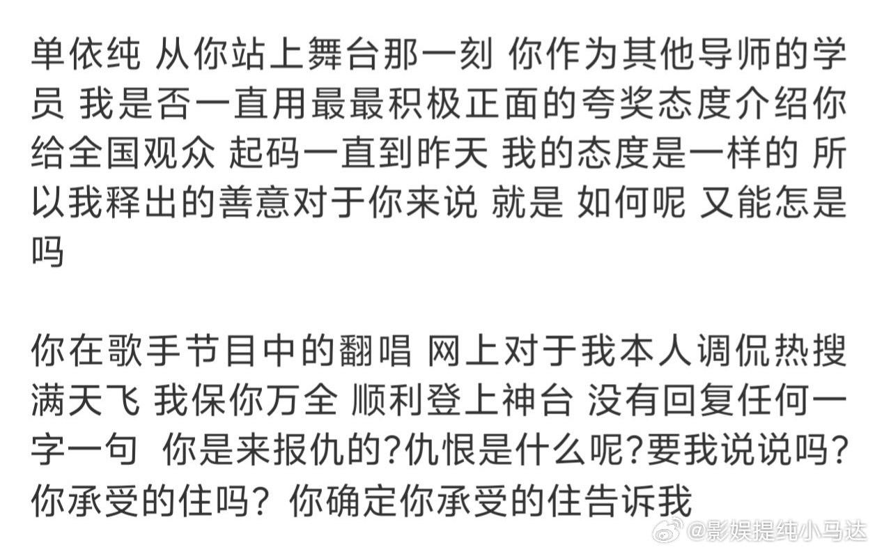 李荣浩本人发声直接告单依纯强行侵权,包括点评了单依纯在歌手舞台上“翻唱”的李白,说是换书皮不换内容。甚至李荣浩可以说直接开撕了单依纯,因为从李荣浩话里话外都能够看出李荣浩相当生气,喊话单依纯拿出自信的态度来面对此次歌曲《李白》的侵权勇气这不是李荣浩简单生气了,而是相当怒了又怒了。成年人都是任由性子以“如何呢 又能怎”的态度来面对侵权的吗?李荣浩最后一段话更是在嘲讽单依纯:短短几年时间,从一个站在舞台上被吓的流眼泪的小女孩,到昨天的强行侵权,这些真的让人唏嘘…