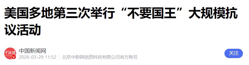 特朗普在国内遭重创。 美国多个城市美国时间3月28日再有反对美国总统特朗普的“不要国王”大规模示威,主办组织预计全美50个州将有3100场活动,将有逾900万人参与,比去年6月及10月两轮同类集会的参加人数更多。 这次示威活动不是偶然,是由“不可分割”等多个反特朗普组织联合发起的,早在活动开始前,主办组织就明确表示,要让特朗普看看美国民众的怒火。 他们提前预告,全美50个州,不管是东部的纽约、华盛顿,还是西部的洛杉矶、旧金山,都会同步举行抗议,一共要办3100场活动,预计参与人数会超过900万。 去年6月和10月,美国也举行过两次“不要国王”的反特朗普集会,但规模都比这次小很多。 根据组织者统计,去年6月的第一次集会,大概有500万人参与,10月的第二次也只有700万人,而这次直接冲到了900万,覆盖了每一个州,相当于每一个州都有几十场示威活动,这样的规模,在美国近代史上都不算常见,足以说明特朗普现在在国内的处境有多难。 美国时间3月28日一早,各个城市的示威人群就陆续聚集起来,没有复杂的组织,大家都是自发走上街头,手里举着“不要国王特朗普”“拒绝独裁”的牌子,嘴里喊着反对的口号,队伍一眼望不到头。 在纽约,示威活动覆盖了所有五个行政区,下午2点左右,曼哈顿第七大道上,游行队伍绵延超过10个街区,纽约市特意出动了数千名警察维持秩序,但还是挡不住汹涌的人群。 首都华盛顿的场面也同样震撼,上千名示威者组成的队伍穿过阿灵顿纪念大桥,聚集在林肯纪念堂前,手里举着“为民主而战”“反对伊朗战争”的横幅,还有人愤怒地喊着“我们不想再卷入战争,无路可退了”。 在西海岸的洛杉矶,大概有10万民众在市中心举行抗议,大家挥舞着美国国旗,批评特朗普的移民政策、经济政策,还有人说“曾经我们为这个国家骄傲,现在却成了全世界的笑柄”。 这次示威的主战场在明尼苏达州,因为今年年初,当地发生了一起悲剧——美国移民执法部门的人员,在执法时射杀了两名普通民众,这让当地民众对特朗普的不满彻底爆发。 当天,尽管天气寒冷,还是有10万人聚集在明尼苏达州议会大厦前,州长、联邦参议员等政界人士也亲自登台讲话,批评特朗普的强硬移民政策,著名歌手还现场献唱,悼念遇难者,现场气氛十分热烈。 参与示威的民众,大多是冲着特朗普的各项政策来的。很多人不满他的移民执法太粗暴,动不动就抓捕、驱逐移民,甚至造成无辜民众死亡;还有人反对他发动伊朗战争,认为这场战争不仅让美国陷入危险,还推高了国内的油价和日用品价格,让普通家庭的生活越来越难。 有一位50多岁的抗议者说,他们缴纳的税款,都被用来资助战争,而自己却连住房、医疗都负担不起,心里实在憋得慌。 值得注意的是,这次示威不仅规模大,参与人群也更广泛,有三分之二的参与者来自大城市之外的地区,甚至包括很多原本支持共和党的保守派城市。 这说明,不满特朗普的人已经遍布全美,不再是少数人的声音,而是全国范围内的抗议浪潮。就连一些以前支持特朗普的人,也因为物价上涨、政策不公,加入到了示威队伍中。 面对这么大规模的示威,特朗普政府并没有表现出重视,反而出言嘲讽。白宫发言人说,这些示威活动是“左翼资金网络”炮制的,没有真正的公众支持,还说只有收钱的记者才会关注。 但这种说法,根本骗不了人,900万人走上街头,每一个人的愤怒都是真实的,每一句口号都代表着对特朗普政策的不满。 据媒体报道,特朗普的支持率现在已经跌到了36%,创下他重返白宫以来的最低点。这次大规模示威,无疑是给他的支持率再泼一盆冷水,也是他在国内遭遇的一次重创。 以前,特朗普总觉得自己能掌控局面,不顾民众的感受推行强硬政策,可这一次,900万人用行动告诉他,美国民众不想被“国王”一样的总统统治,他们想要的是公平、民主,想要的是能让普通人过上好日子的政策。 这次示威活动,虽然当天晚上就基本结束,但很多地方还是出现了小范围冲突,警方不得不出动马队、使用催泪瓦斯驱散人群,还有数十人被逮捕、多人受伤。 组织者也表示,这次“不要国王”示威只是一个开始,他们不会因为一次集会就停止,接下来还会继续发动民众,反对特朗普的不当政策。 说到底,特朗普这次在国内遭重创,都是他自己造成的。他不顾民众意愿,独断专行,推行的政策既伤害了普通民众的利益,也引发了全国范围内的不满。900万人上街抗议,50个州同步发声,这就是最真实的民意,也是对特朗普最沉重的打击。
