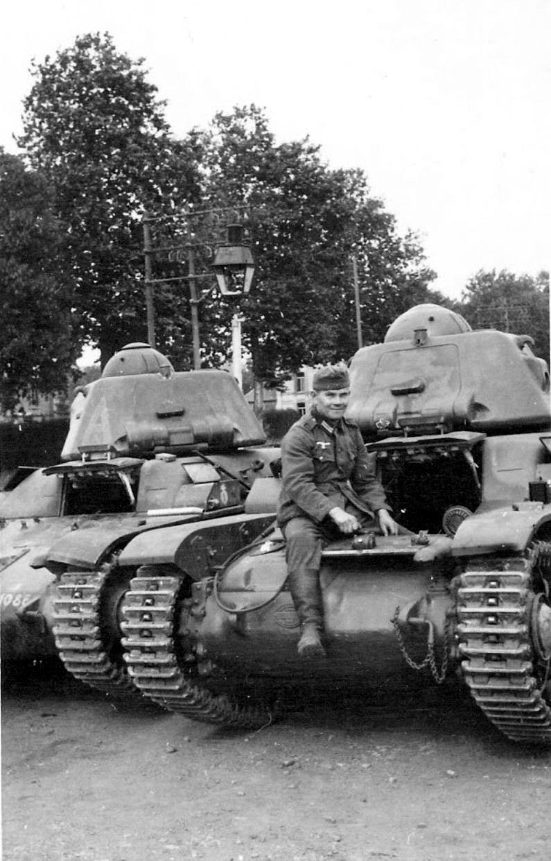 [呲牙] 德国人这是捡了多少“洋落儿”啊(续)——1940 年,一名德国士兵坐在缴获的法国雷诺 R35 轻型坦克上留影,车体的舱盖已经打开。 法国 1930 年代为步兵支援设计的轻型坦克,1936 年列装,全重约 10.6 吨,单人炮塔,主武器为 37mm SA 38 短管炮,装甲最厚 40mm,机动性一般,是二战初期法军主力轻坦之一。 德军缴获后继续使用这批坦克,并给予了一个德军编号 Panzerkampfwagen R35 731(f),主要用于二线占领区巡逻、反游击、警戒与装甲兵训练;少量被改装为弹药输送车、工程车,极少投入一线作战。