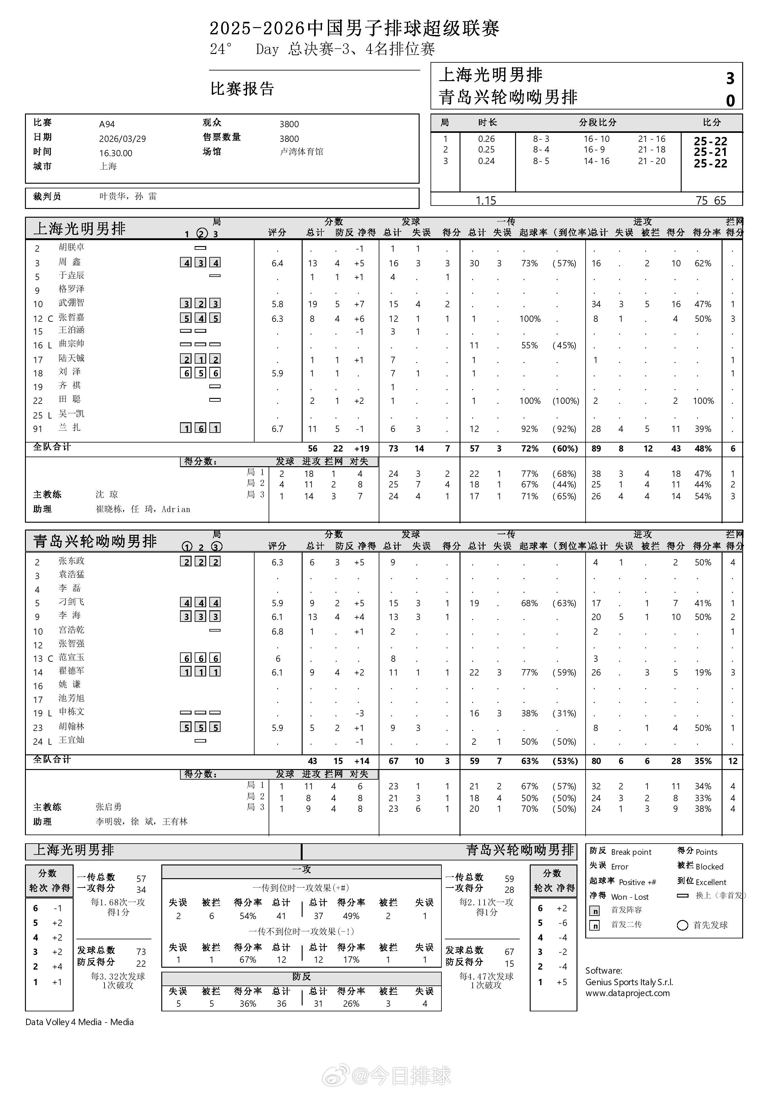 2025-2026中国男排超级联赛 A级总决赛三四名决赛次回合上海3-0青岛得分统计,武弸智19分,周鑫、李海各13分,兰扎11分。