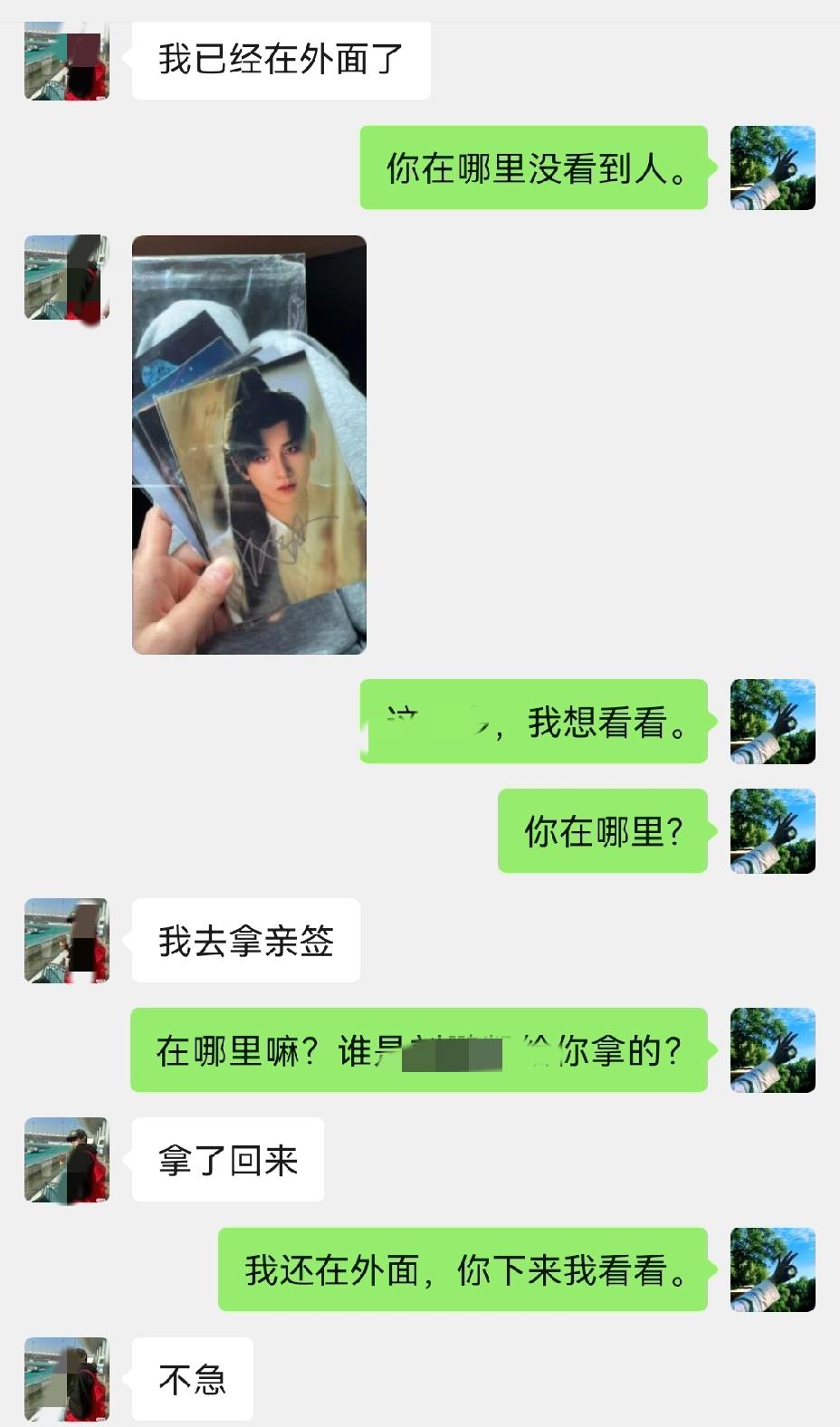 “你想不想要成毅的亲签?”孩子问,我说:“真的能拿到吗?不会吧,亲签可不是随便谁就能搞到哦!”,“你别管,就说想不想要嘛?“想啊,怎么不想?”我激动的回答。她说她有一朋友认识一导演能拿到,我半信半疑! 果然,今天孩子终于帮我搞到了成毅的一张亲签,让我又惊又喜!拿到手里东看西瞧,心里冒出了很多想法:“到底什么样的才是真的亲签?相纸和字有什么特点?我如何才能相信这是真的亲签?有没必要去验证真伪?”脑袋里不自觉的冒出了很多想法。 虽然觉得这惊喜来的太宊然,觉得不太可能是真的,但一想到是孩子的一番心意,这份心意本身就很难得。这个圈子的“水”本来就深,没必要太在意真假,何必又让自己和孩子都不开心! 曾听说过收藏圈里有句话叫“只买不卖,真假自娱!”毕竟孩子的这份心意,远比一个签名本身珍贵。