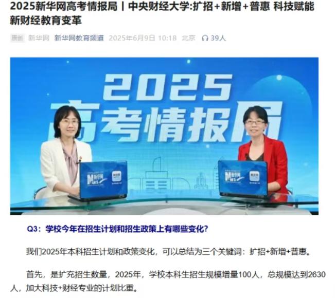中央财经大学启动2026本科招生工作,计划扩招100人,将在22个省(市、区)实行零调剂政策。 近日,从高校官网了解到,中央财经大学已启动2026年本科生招生计划和报考指南的编制工作,这其中透露出几个关键信息,与考生息息相关。 1、招生计划将扩招100人。2026年,中央财经大学本科招生计划将达到2730人,相对2025年扩招了100人(2025年计划招收2630人)。 2、将在22个省(市、区)实行零调剂政策。在录取过程中,专业调剂是考生最大的顾虑,如今,中央财经大学在绝大多数招生省市实行零调剂,可以最大限度满足考生的专业选择,提高考生的体验感,相信招生吸引力将进一步提高。 3、招生专业更合理。今年已经明确,对生源质量持续下滑或培养优势不明显的专业(类),可暂停招生。可以预见,考生眼中的“天坑”专业将基本消失。 2026年高考越来越近,关注我了解更多高校招生信息。