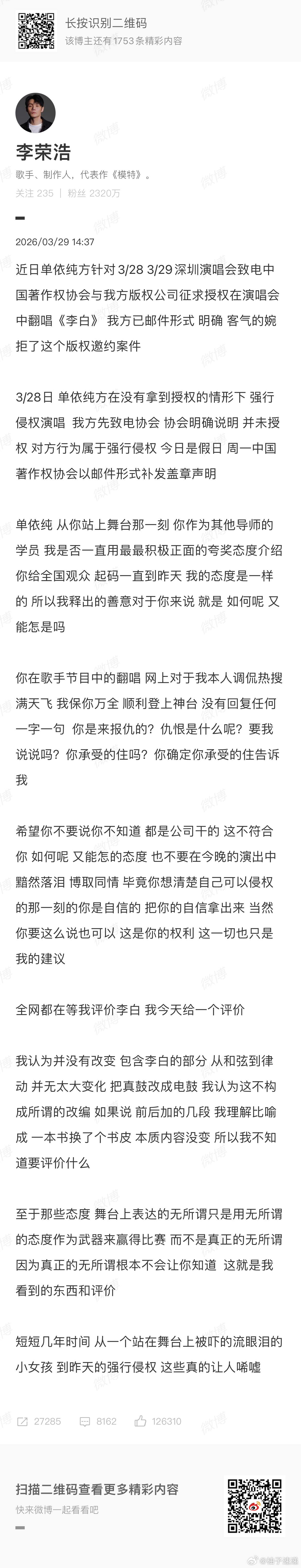 李荣浩 单依纯强行侵权李荣浩在微博公开喊话单依纯:婉拒授权后,对方仍在深圳演唱会上演唱《李白》。他提到,当年《好声音》自己在台下夸她是“天生的歌手”,单依纯夺冠后哭着感谢导师。如今却走到这一步,他补了一句:“也不要在演唱会上用情绪引导关注。”从曾经的欣赏到公开回应,这转变确实让人意外。