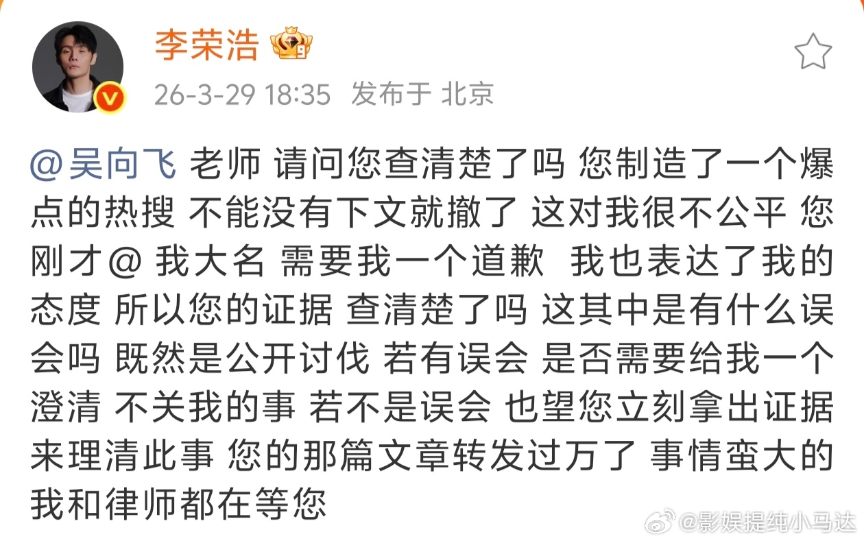 吴向飞疑似回应李荣浩 李荣浩再度“重拳出击”喊话吴向飞老师拿出证据来,还是其中到底有什么误会?