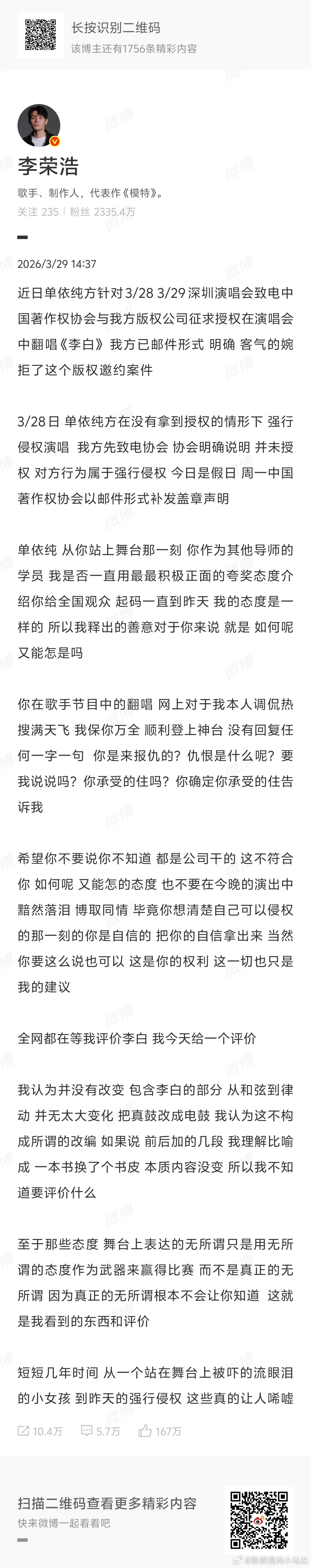李荣浩本人发声直接告单依纯强行侵权,包括点评了单依纯在歌手舞台上“翻唱”的李白,