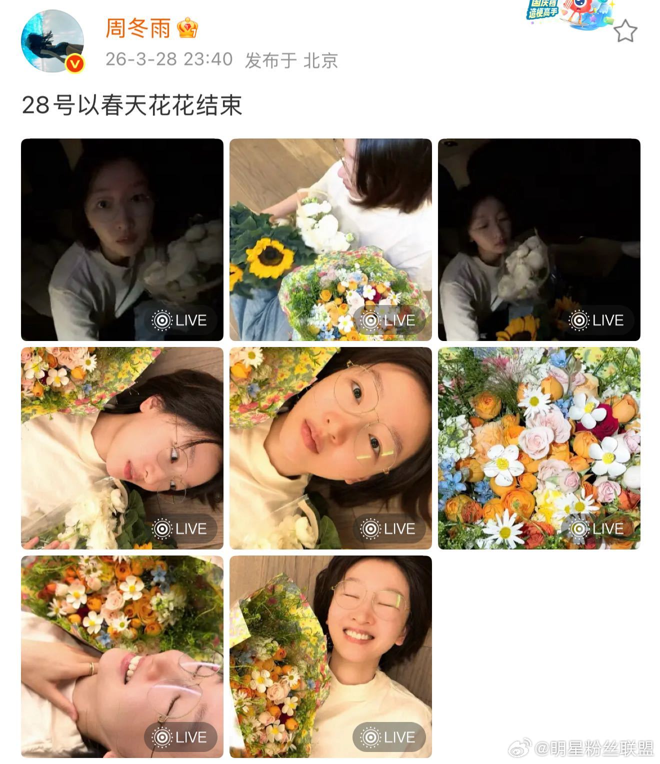 周冬雨和粉丝送的花合影 素颜戴眼镜和春日花花合影,周冬雨状态真的好好!这花还是粉丝送的,我们三金影后就这么会宠粉周冬雨28号以春天花花结束
