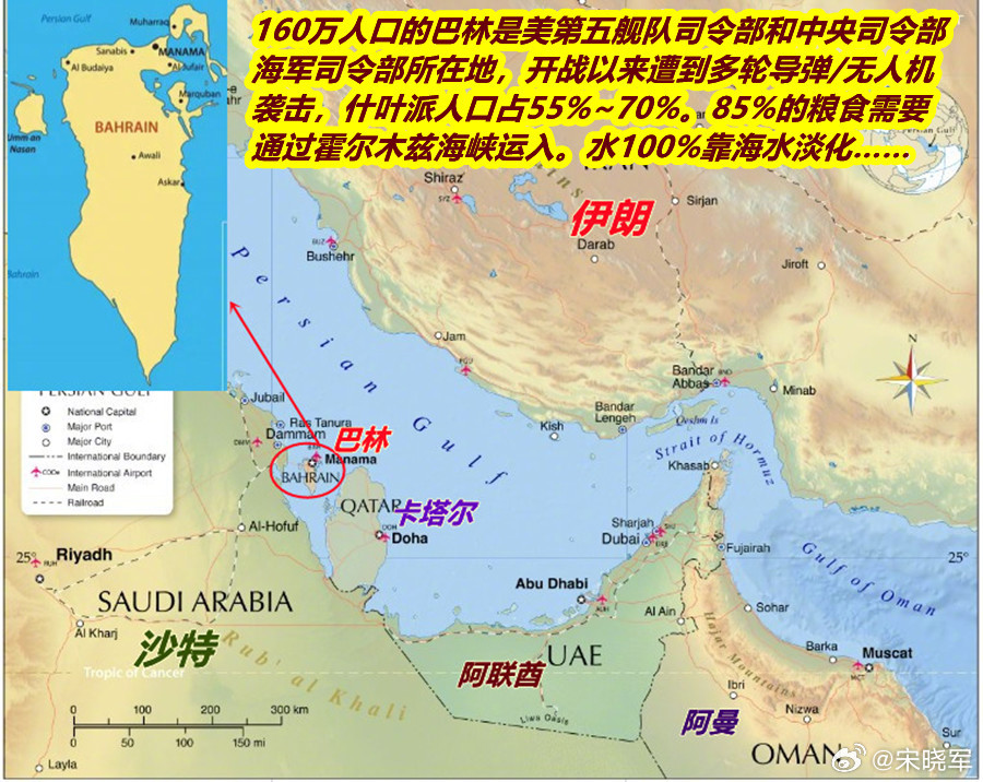 图1/2:巴林遭遇史上最大“内外焦困”;图3:这个160万的小国也许是美陆战队第31远征队前来救援的“困难户”——该国是伊朗利用教派搞“颜革”的重点(什叶派占人口约70%)。据称巴林安全部队已抓获上百名为伊朗提供军事目标的“内鬼”。几天前,伊朗革命卫队声还公开称击中了在巴林的美海军AI明星部队——第59特遣队的无人艇。