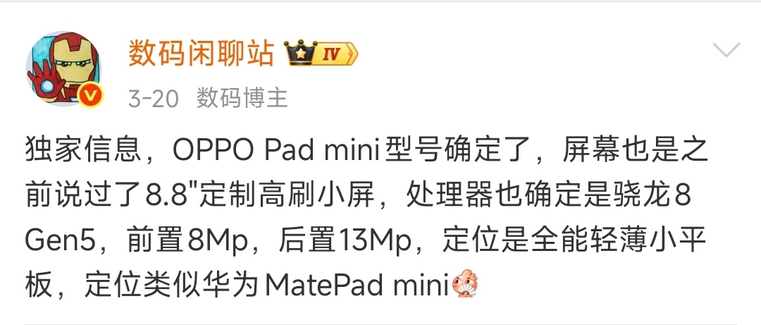 OPPO乔家栋曝光了OPPO四月的新品,全新的小尺寸平板,不出意外就是OPPO Pad mini,骁龙8Gen5+8.8寸定制高刷小屏!