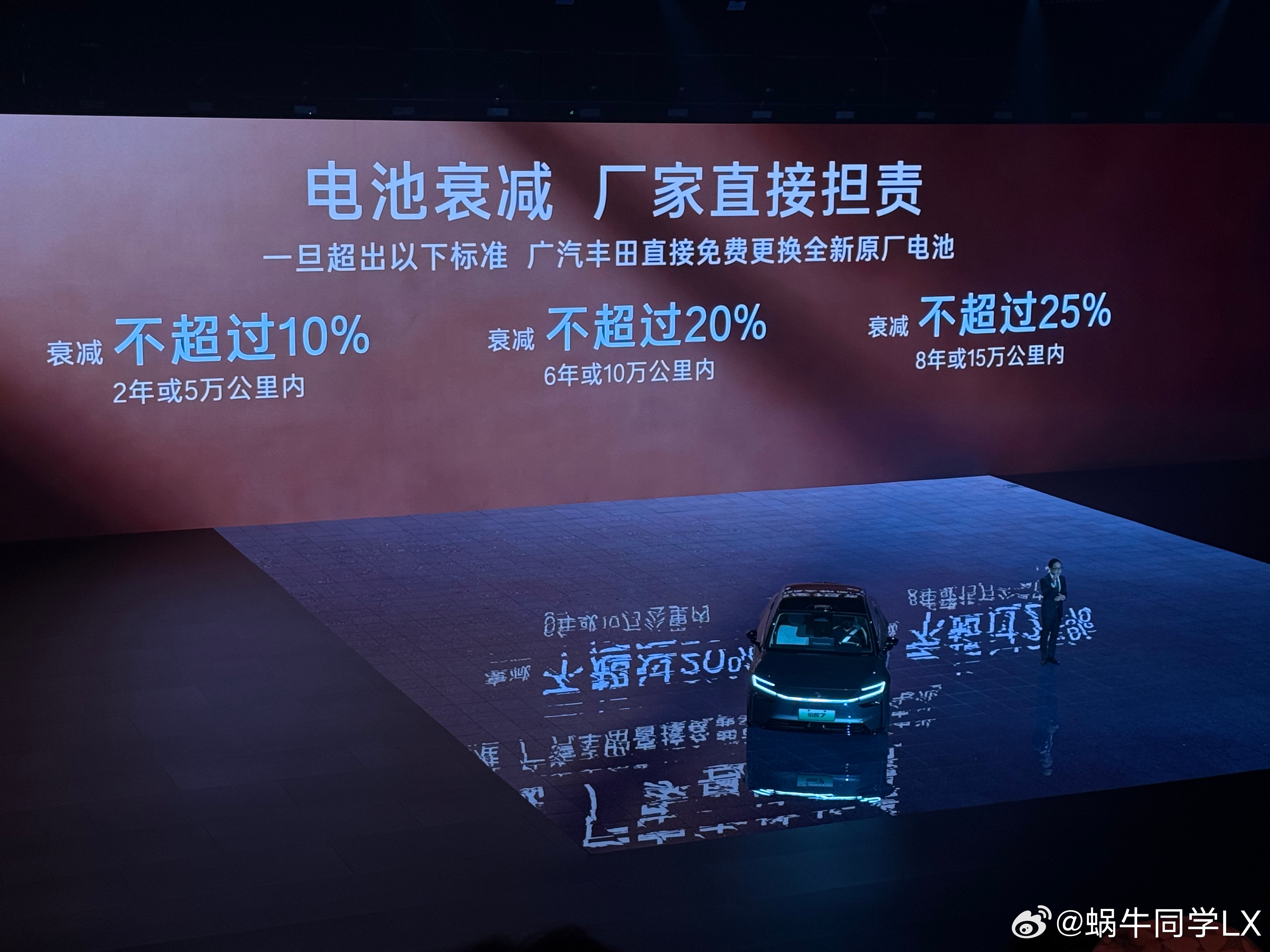 针对用户顾虑的电池衰减情况,铂智7以更严苛的条件作为寿命设计前提,植入丰田严苛的“全周期0析锂”安全要求,叠加电压保护策略,有效延长电池使用寿命。凭借品质底气,广汽丰田承诺电池衰减2年或5万公里内超10%、6年或10万公里内衰减超20%、8年或15万公里内超25%厂家直接担责,免费更换全新原厂电池。