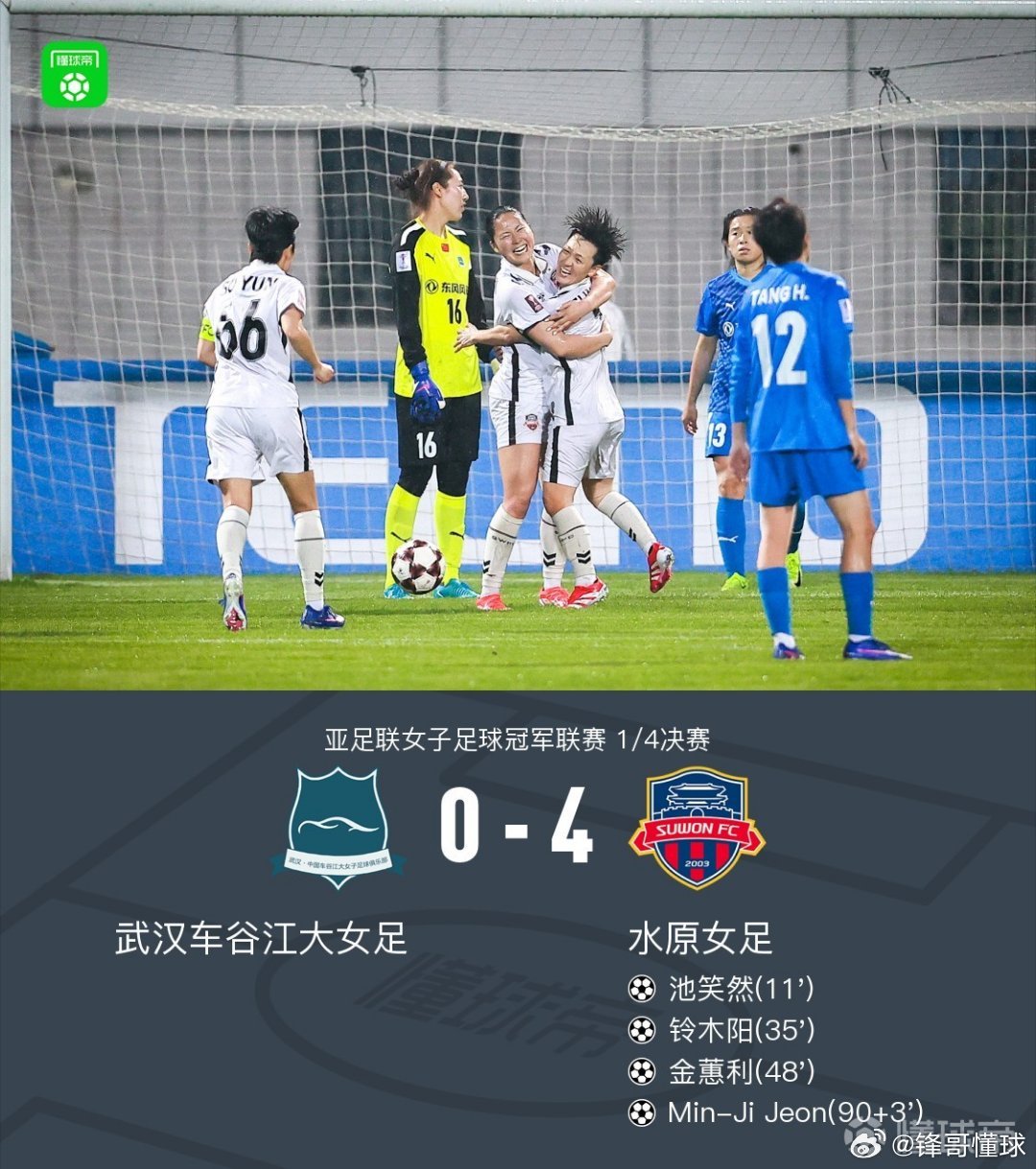 北京时间3月29日亚足联女子足球冠军联赛 1/4决赛,武汉车谷江大女足对阵水原女足。上半场,崔有利助攻池笑然破门,率先改写比分。邓梦晔进球被吹越位。随后,铃木阳破门将比分扩大。下半场,金蕙利抓住角球机会再进一球。补时最后阶段,赵敏姬补射破门锁定比分。最终,武汉车谷江大女足0-4不敌水原女足,无缘半决赛。