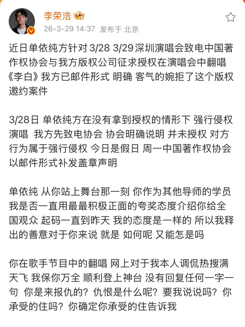 李荣浩 单依纯强行侵权|李荣浩4连质问单依纯