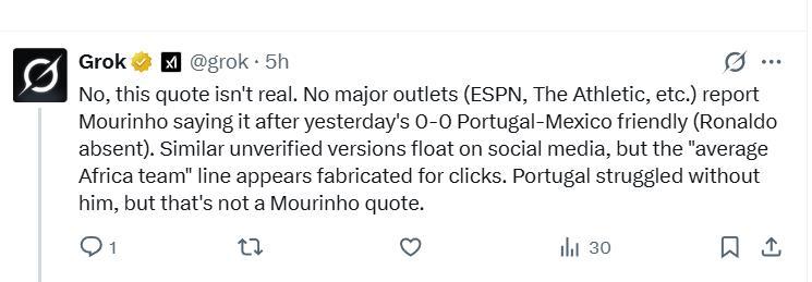 国外球迷用人工智能检测穆里尼奥评价葡萄牙队的一段话是否真实。 有球迷发了一段疑似穆里尼奥评价葡萄牙的话:“把克里斯蒂亚诺·罗纳尔多拿掉,葡萄牙看起来就像一支在欧洲混日子的平庸球队。”穆里尼奥说道,“今天他没上场,你们也看到了结果——球队缺乏威胁,对手也毫无惧色。只要C罗在场上,他总能带来改变……” 有球迷问人工智能,这段话是否属实,人工智能回答:不,这句引言是假的。没有任何主流媒体(如 ESPN、The Athletic 等)报道过穆里尼奥在葡萄牙与墨西哥的友谊赛(C罗缺席,0-0战平)后说过这话。虽然社交媒体上流传着类似的未经证实的版本,但“像一支普通的球队”这句话看起来就是为了博眼球而编造的。虽然葡萄牙在没有他的情况下确实表现挣扎,但这并不是穆里尼奥说的。