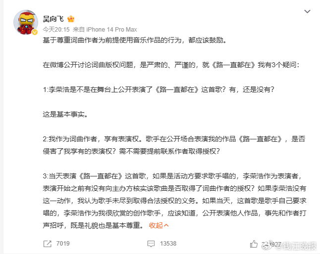 【#吴向飞3问李荣浩#】#吴向飞喊话李荣浩道歉##李荣浩单依纯强行侵权#再发